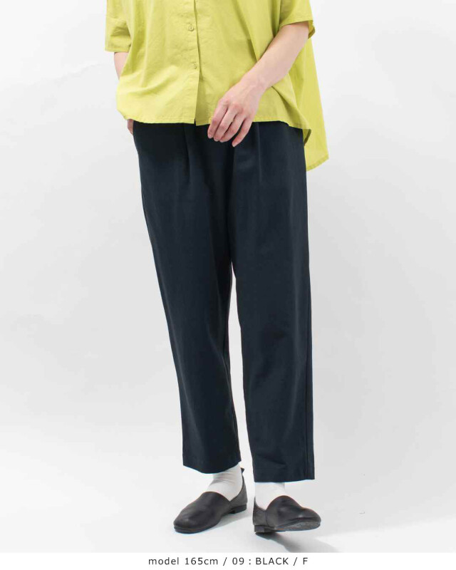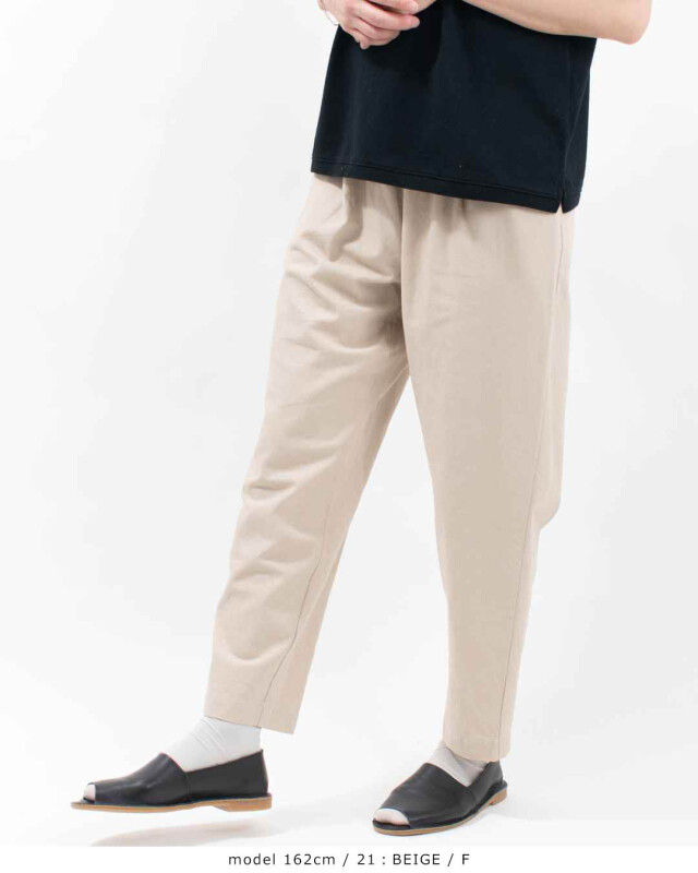 ヒップ部分にゆとりを持たせて、裾にむかってテーパードに仕立てたパンツです。すっきりとしていながらも、少し丸みをもたせたフォルムで腰まわりをカバーします。
