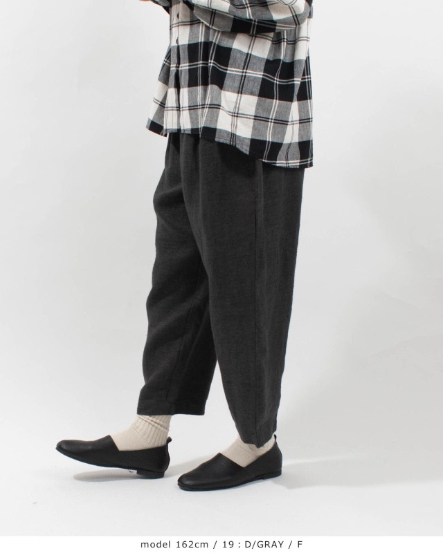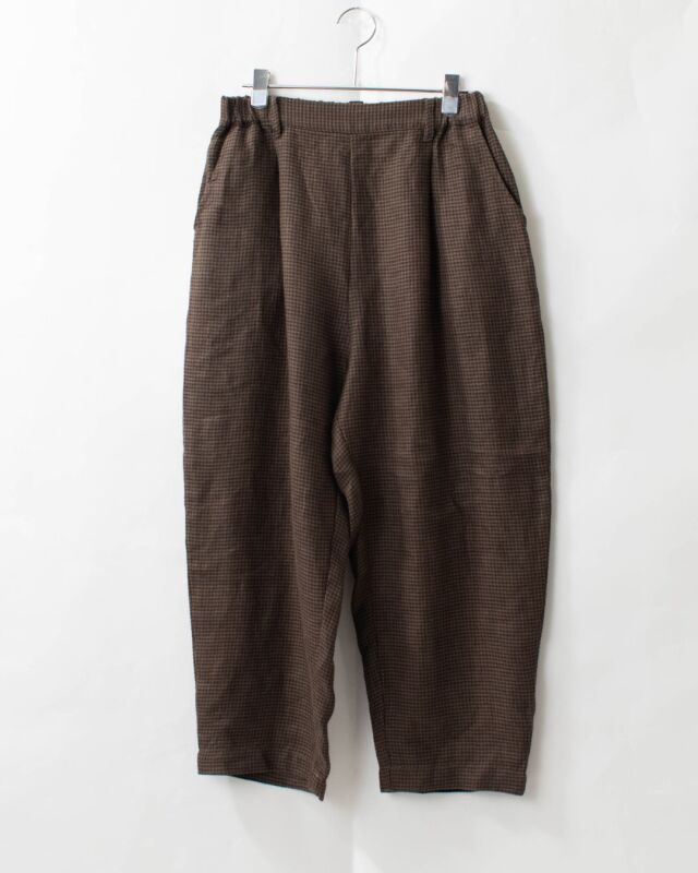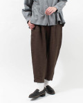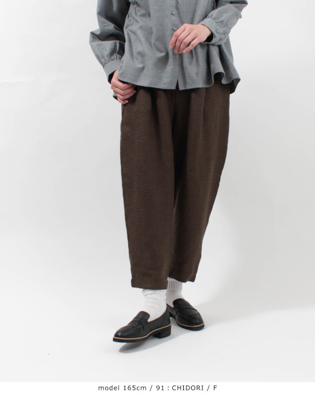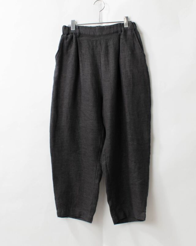 起毛した素材があたたかみのあるゆったりとしたシルエットのテーパードパンツ。ヒップ部分にゆとりを持たせて、裾にむかってテーパードに仕立てたパンツです。