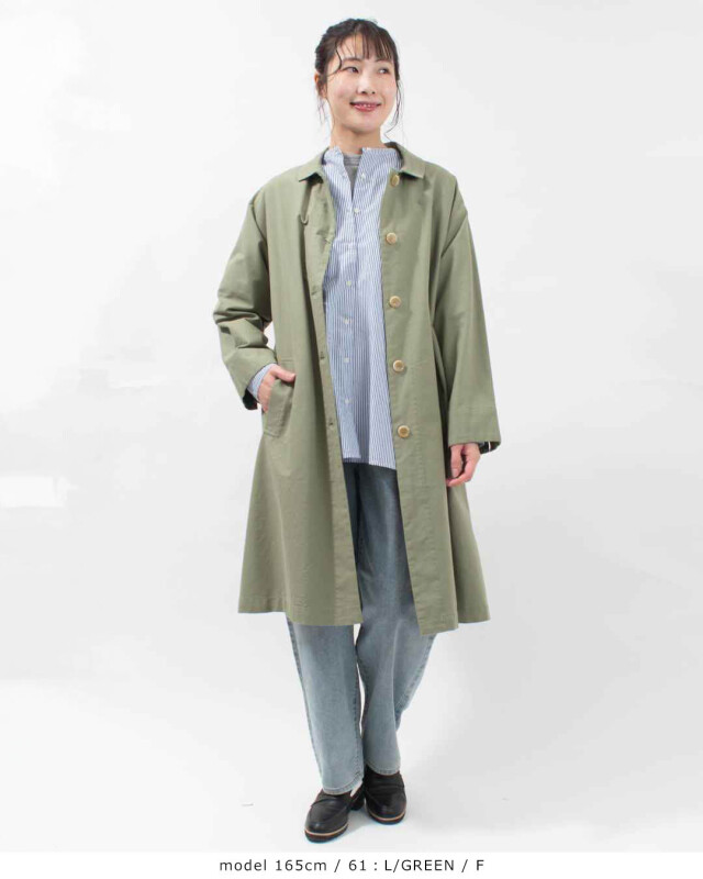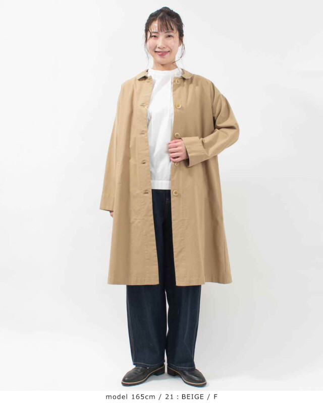 シンプルなステンカラーデザインに、ゆとりのある身幅とストンと落ちる縦ラインで、自然に体型をカバー。