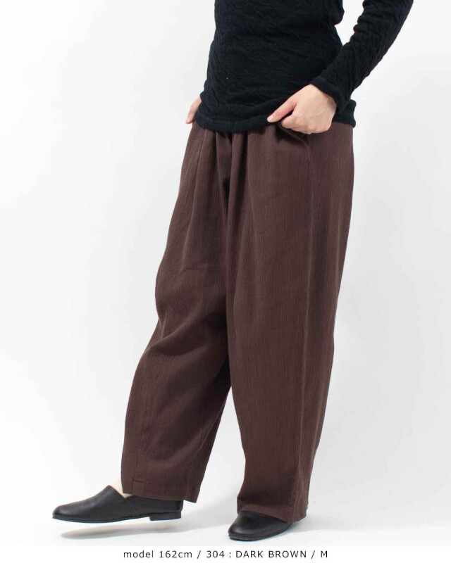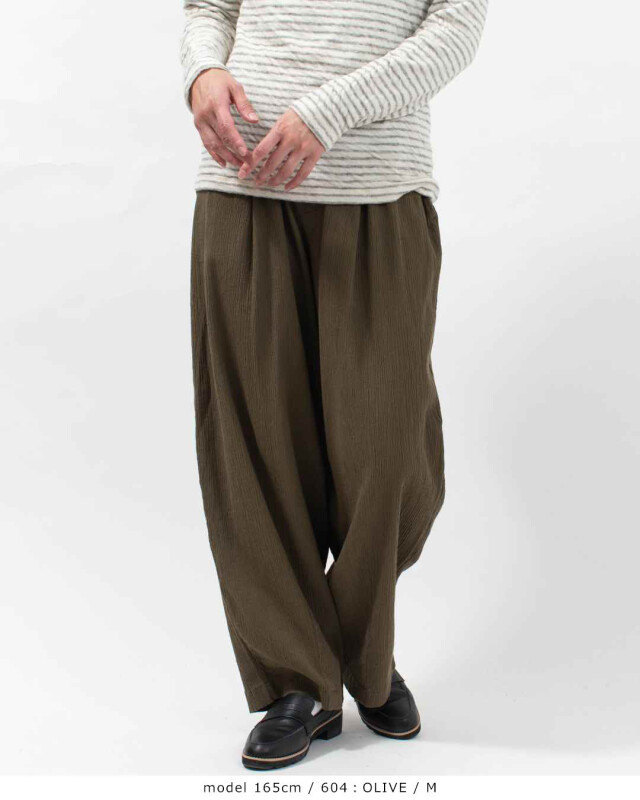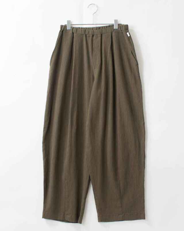 「ONI」のゆったりしたタックテーパードパンツをラインナップ。深めのタックと裾のダーツでやや丸みのある独特のテーパードシルエットとなっています。