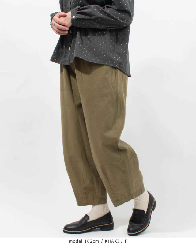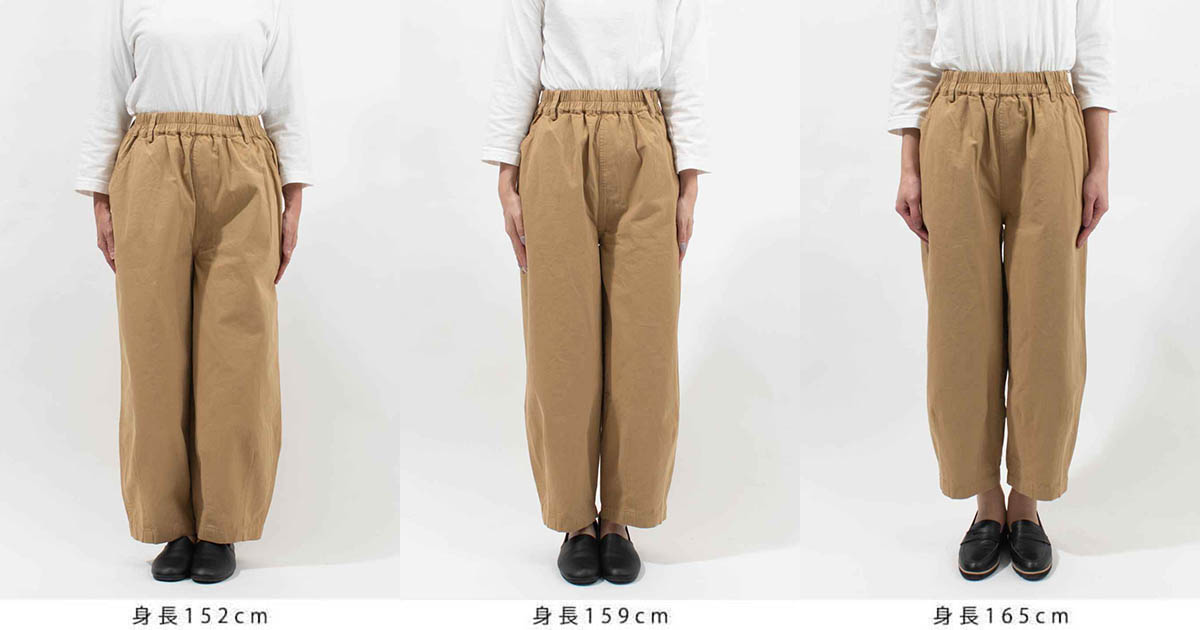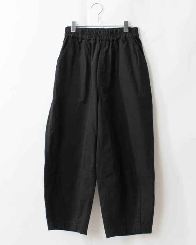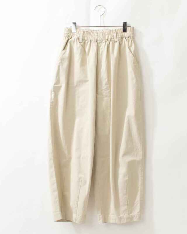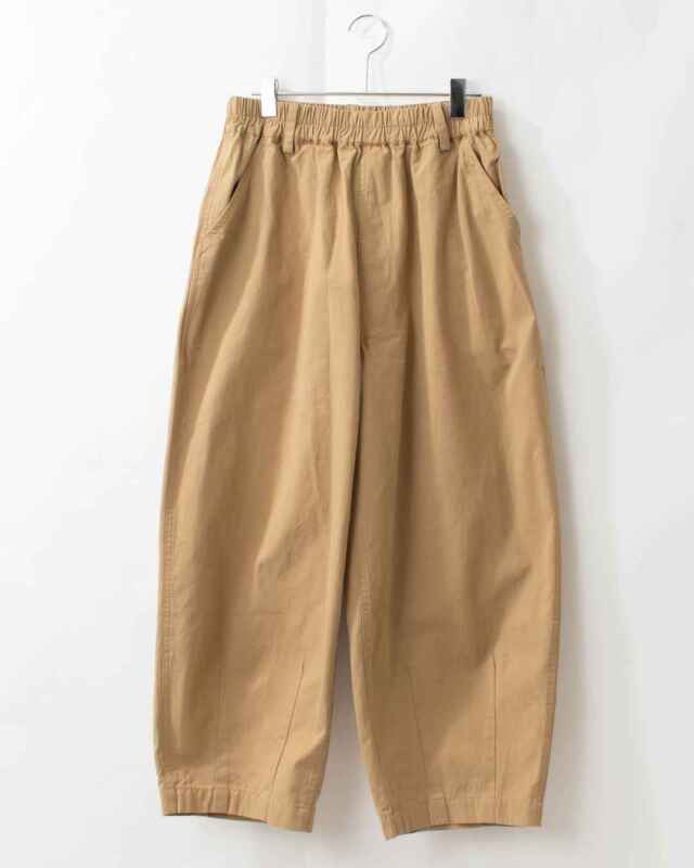 裾にダーツを施したふんわりしたさり気ない可愛さのある シルエットに仕上げたバレルパンツです。ウエストはゴム仕立てでリラックスして着用して頂けます。
