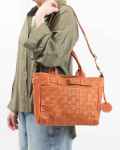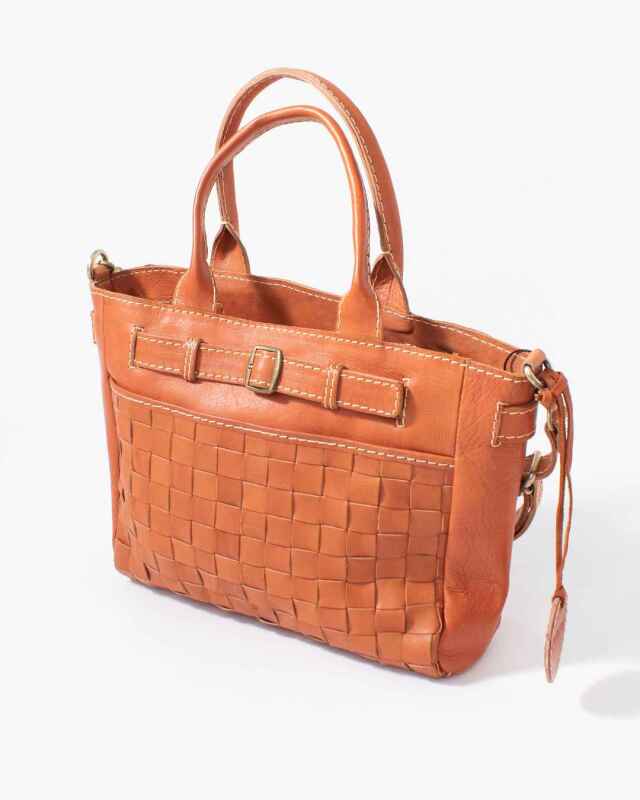 職人の手により1枚ずつ手で染めては天日で乾かすなどの工程を何度も繰り返して仕上げたカウレザーをメッシュ状にし、格子状に1本1本手編みで縫製しています。一目で本革とわかるナチュラルな風合い、素朴な匂いや本来の色の濃淡が、使い込むほどに味わい深く添加をし持つ人になじんでくるので、愛着の湧くバッグとなります。
