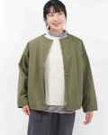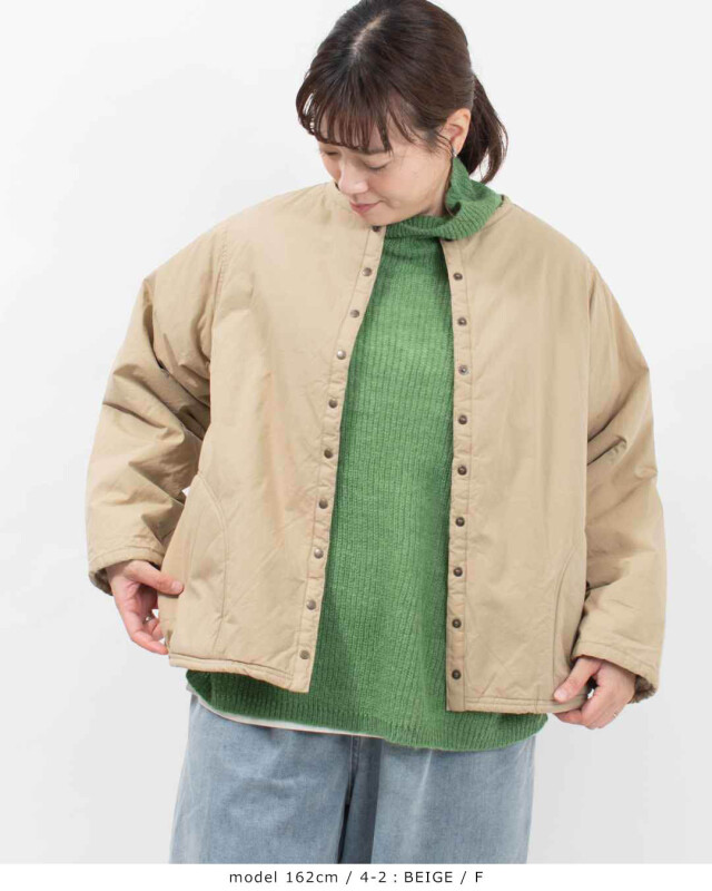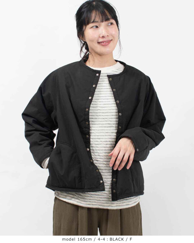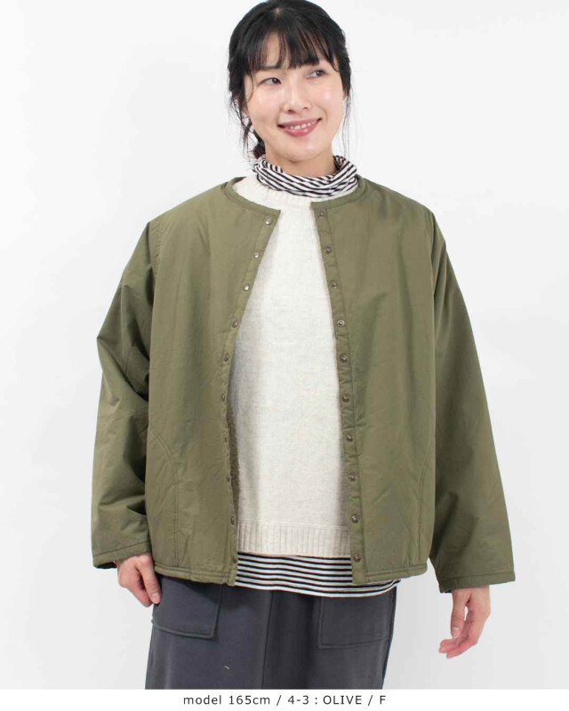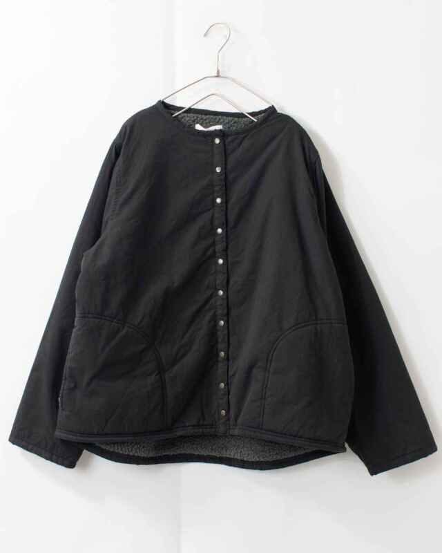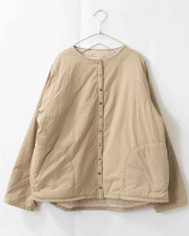 適度なハリがあり、肌触りも優しい綿100%のツイル生地を使用したノーカラー裏ボアジャケットです。裏地のボアは保湿性に優れ、重ね着をしてもごわつかない程良い生地の厚さのボア。