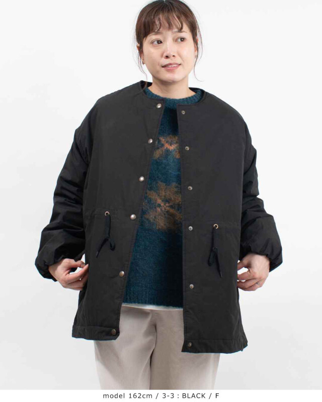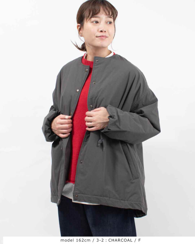 ノーカラーでマフラーやパーカと好相性です。