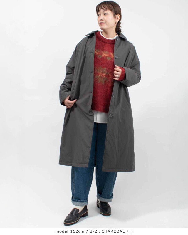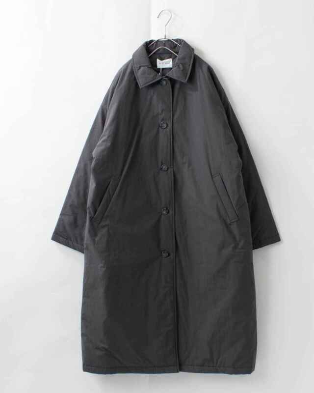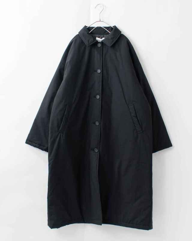 ひざ下まですっぽりとあたたかく包み込む中綿入りのロングコートです。ボリュームを感じにくい、すっきりとしたAラインのシルエットが魅力!