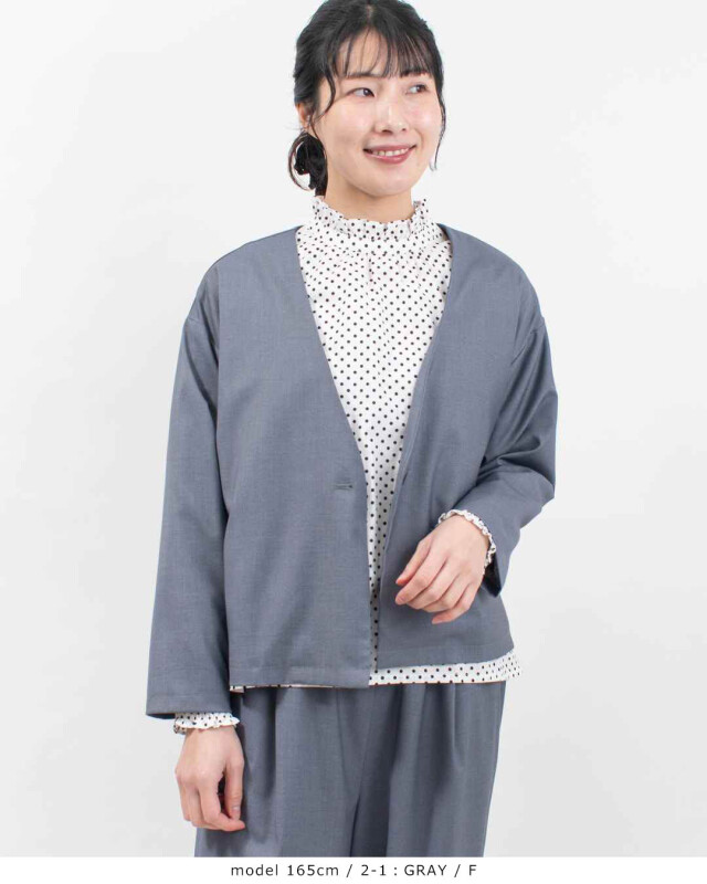 表面感のきれいなポリエステル/レーヨン素材を使用した、Vネックバックギャザージャケット。しっかりとしたハリ感がありながら、ストレッチ性も備えており、しなやかな着心地が魅力です。