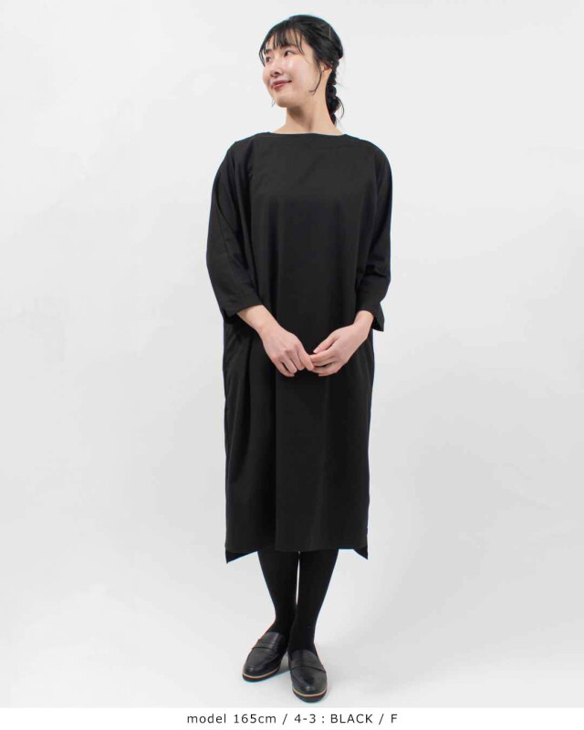 表面感のきれいなポリエステル/レーヨン素材を使用した、大人のためのドルマンワンピース。しっかりとしたハリ感がありながら、ストレッチ性も備えており、しなやかで快適な着心地を叶えます。