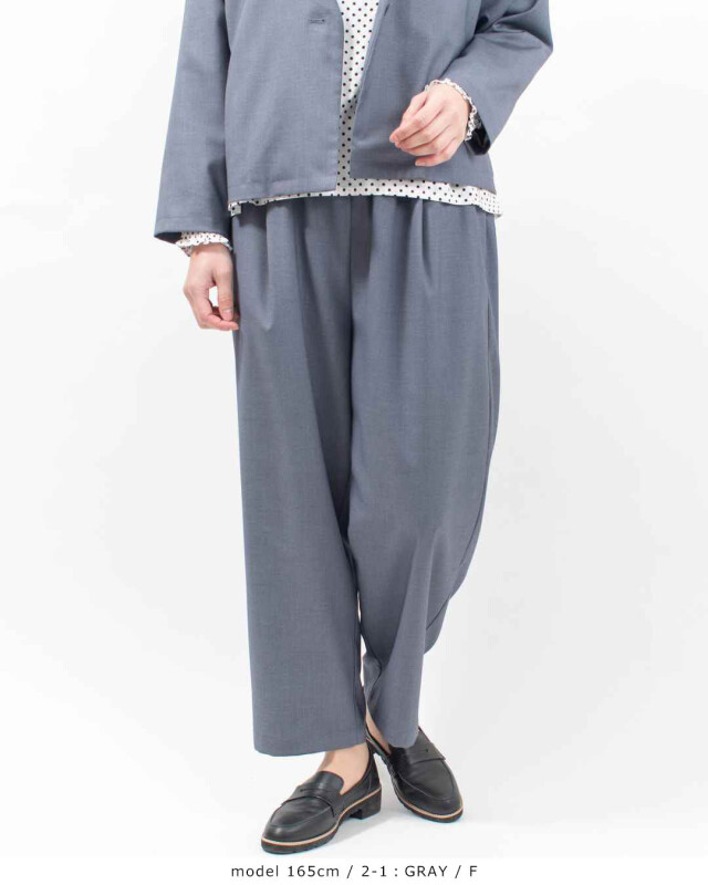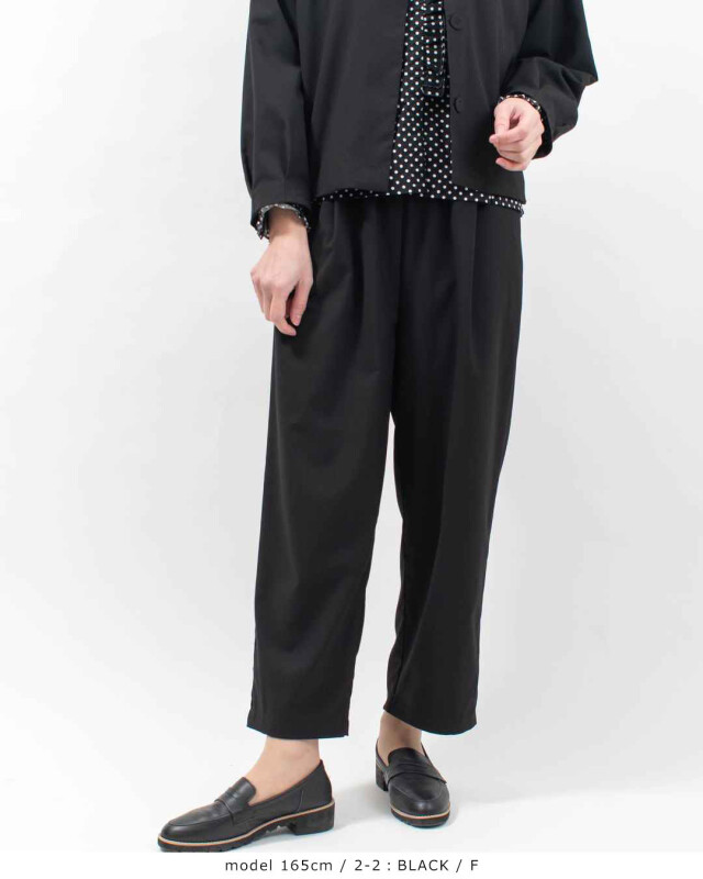 表面感のきれいなポリエステル/レーヨン素材を使用した、きれい見えと快適さを両立したタックテーパードパンツ。しっかりとしたハリ感がありながら、ストレッチ性も備えており、しなやかで動きやすい穿き心地が魅力です。