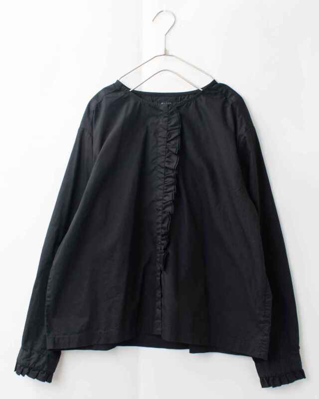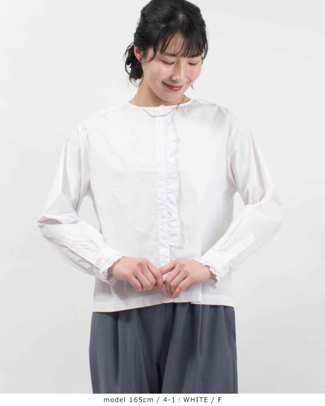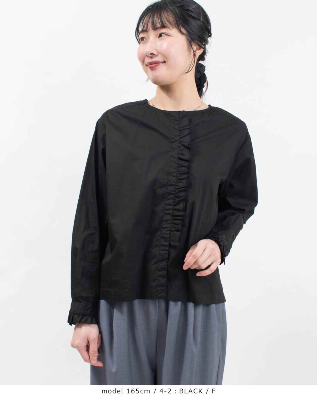 フリルがそっと華やぐ、上品ブラウス。フロントの比翼前立てに沿ってあしらったフリルが、上品な縦ラインをつくり、顔まわりをすっきり見せてくれます。