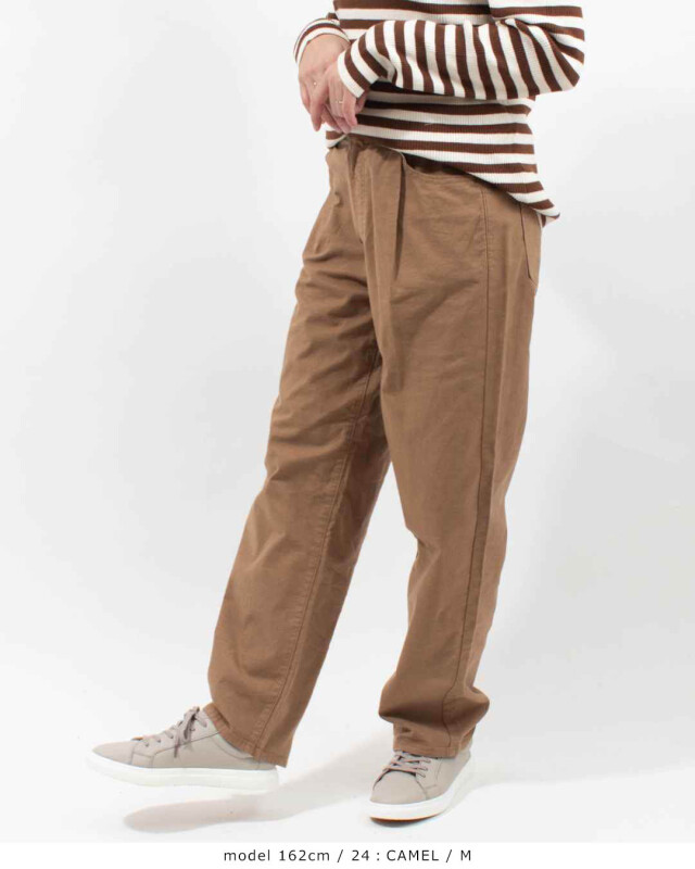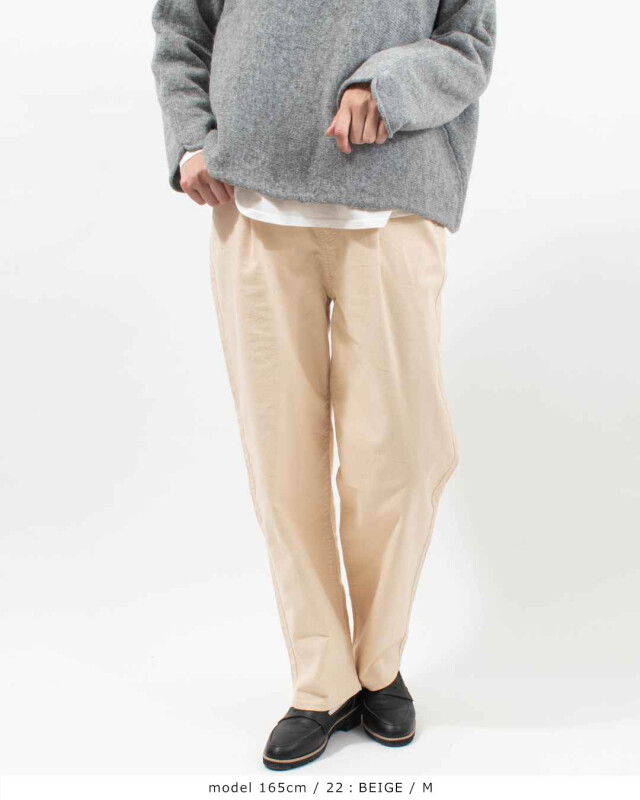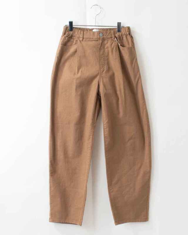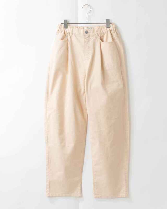 5ポケットのディテールに、フロントタックをとり腰回りにボリュームを持たせ立体的なカーブラインを強調したパンツです。ウエストは総ゴムでZIPのないデザインがリラックスした着心地のアイテム。