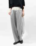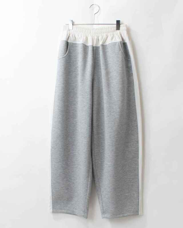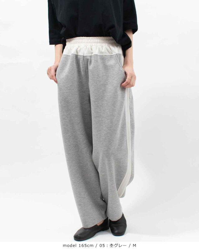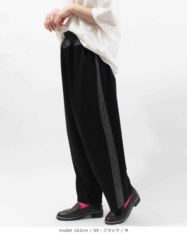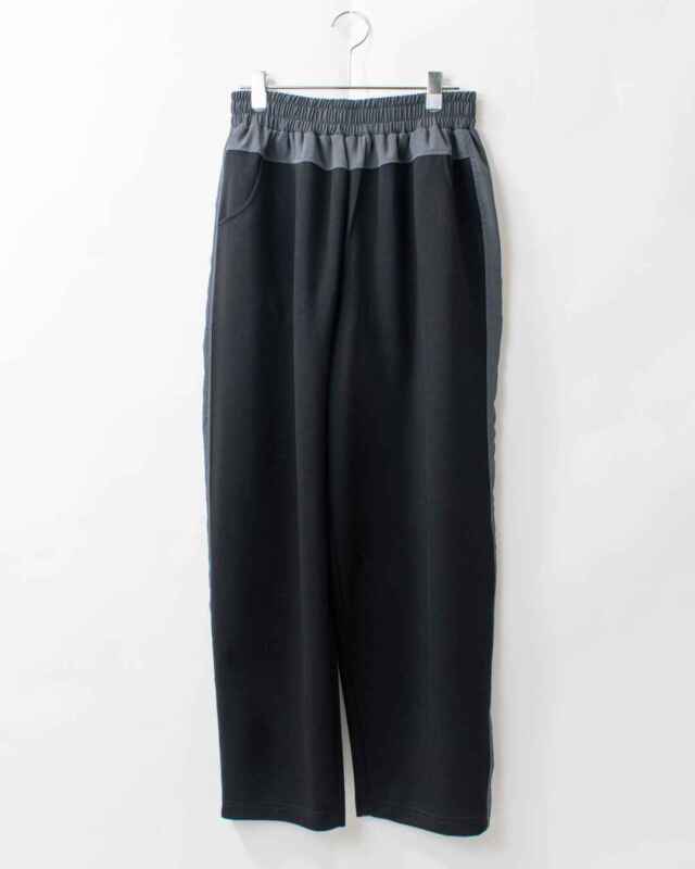 異なる素材を組み合わせた切り替えデザインが目を引く、リラックス感のあるパンツ。なめらかで落ち感のある素材にストレッチ性を備え、見た目はすっきりとしながらも快適な穿き心地に仕上げています。