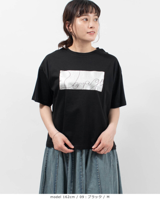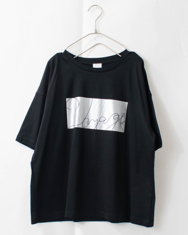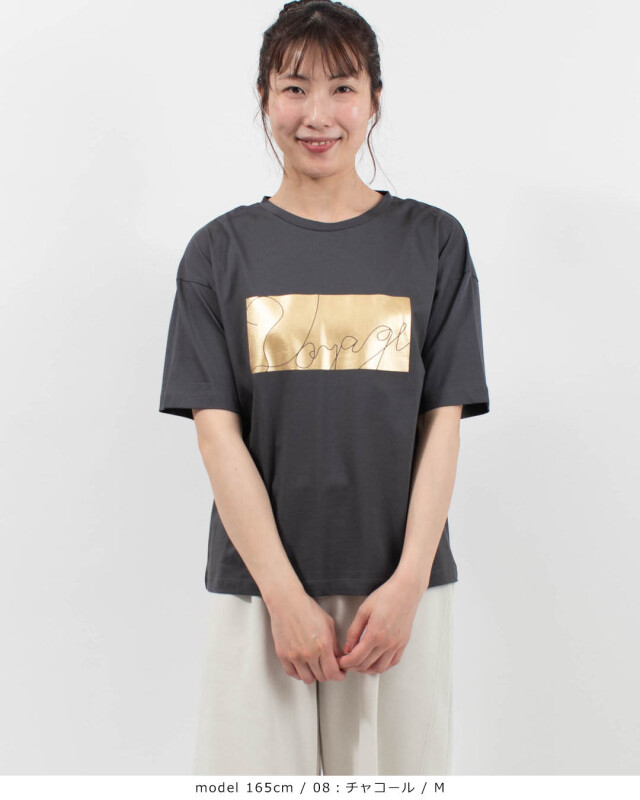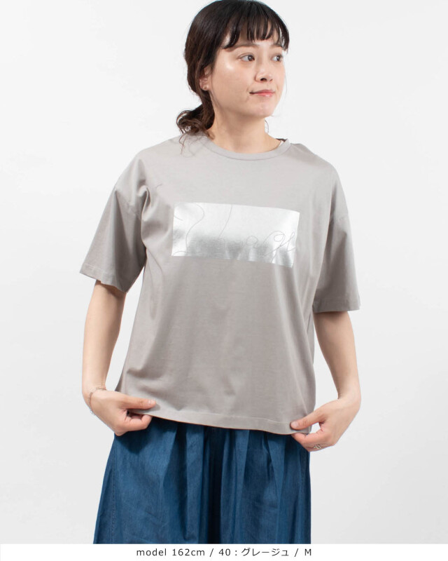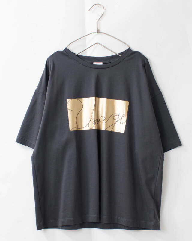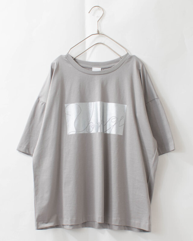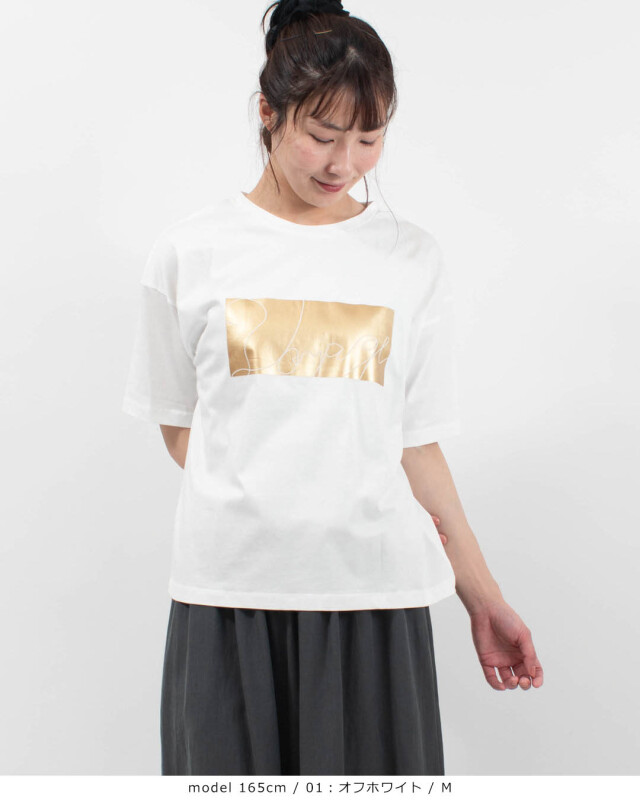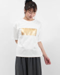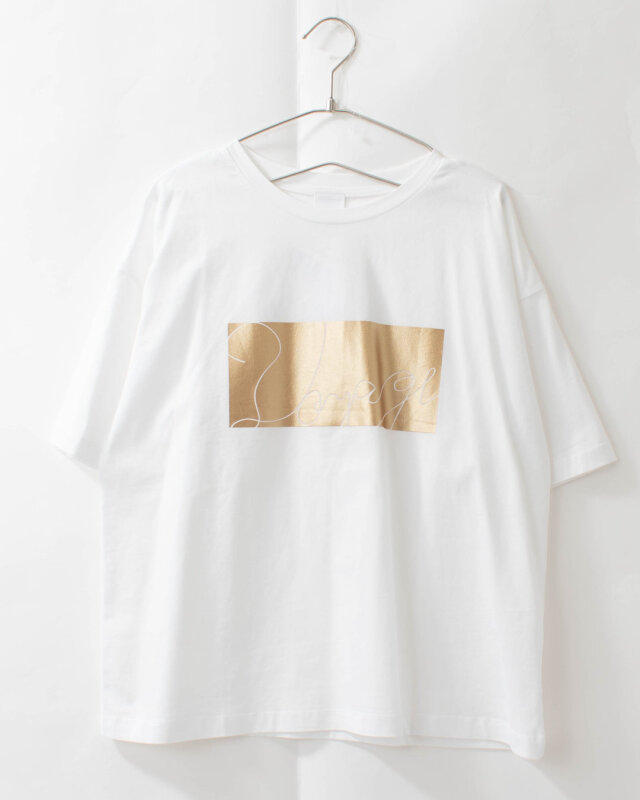 一筋の光のような箔のラインを主役にすることで、カジュアルなTシャツにモードで洗練された空気感を与えています。