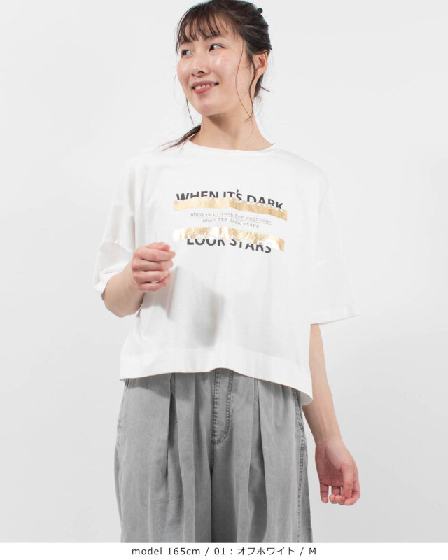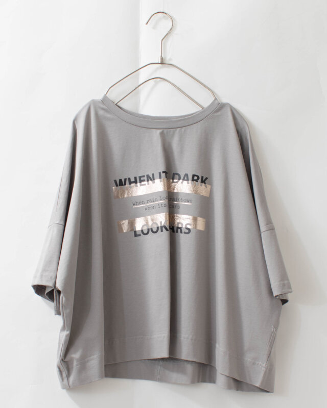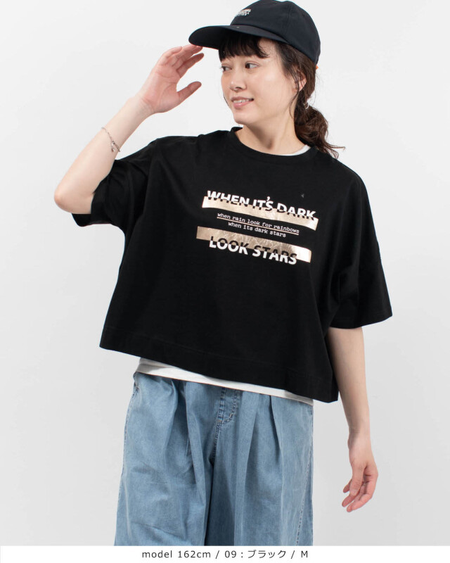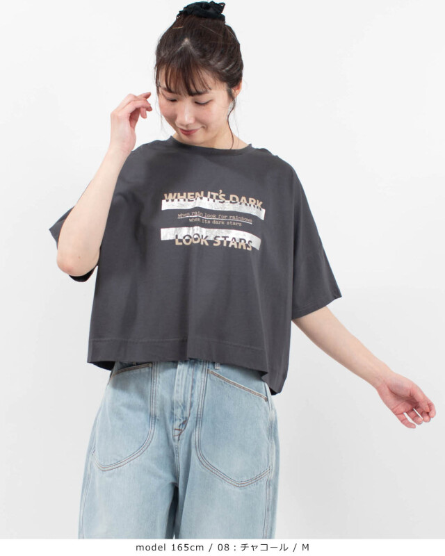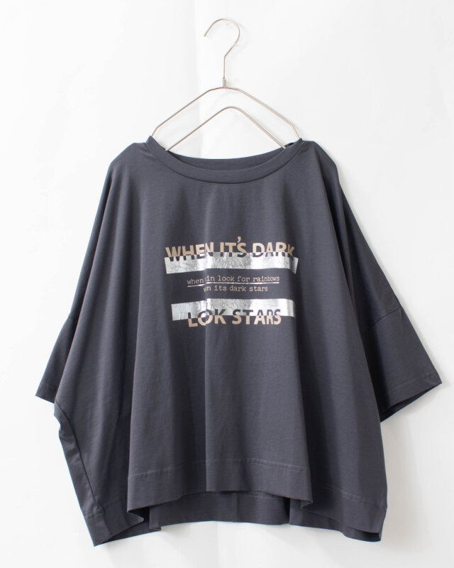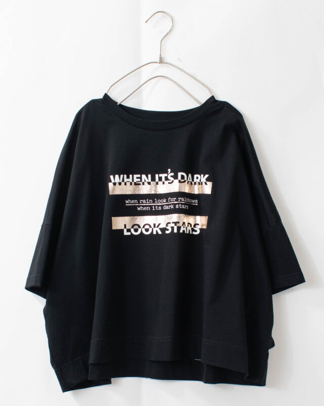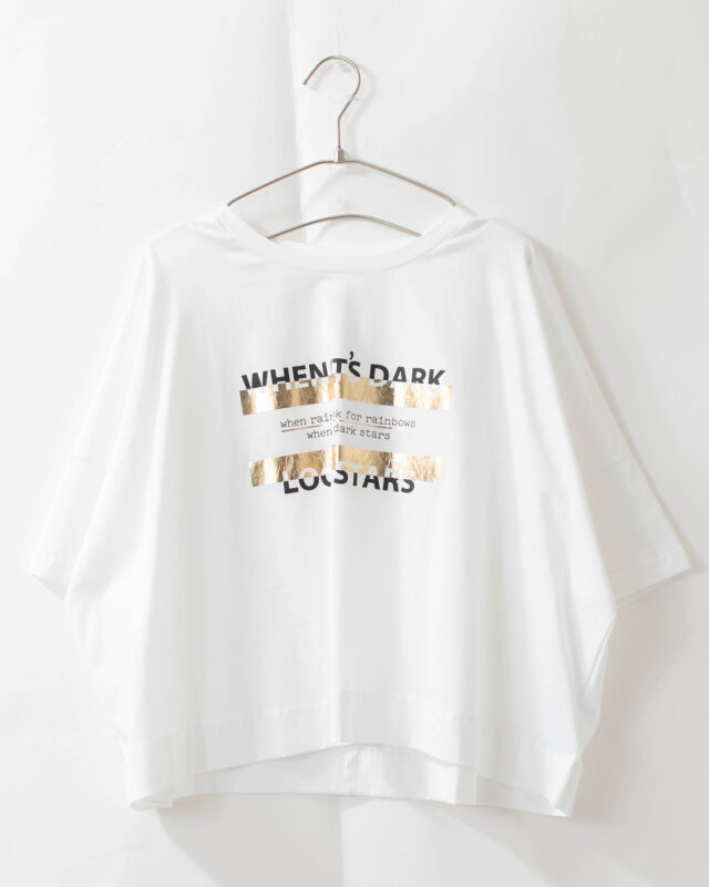 vingtroisの「WHEN IT'S DARK LOOK STARS」プリントTシャツは、箔×ロゴでスタイリングの主役になる一枚です。