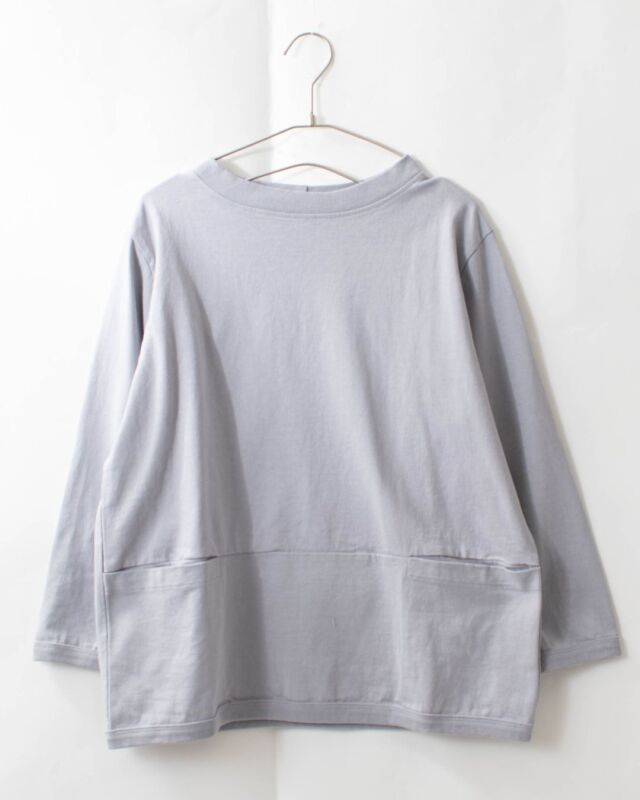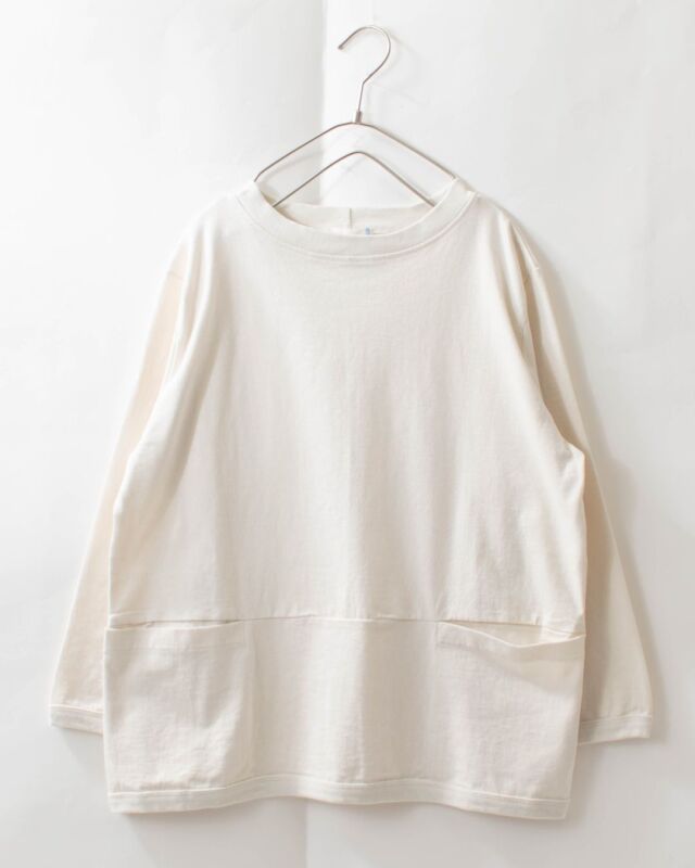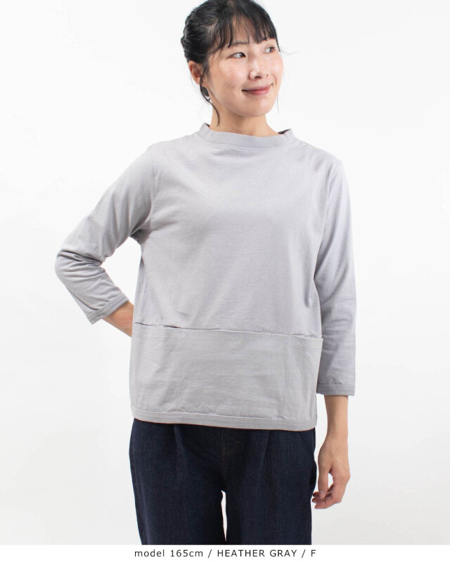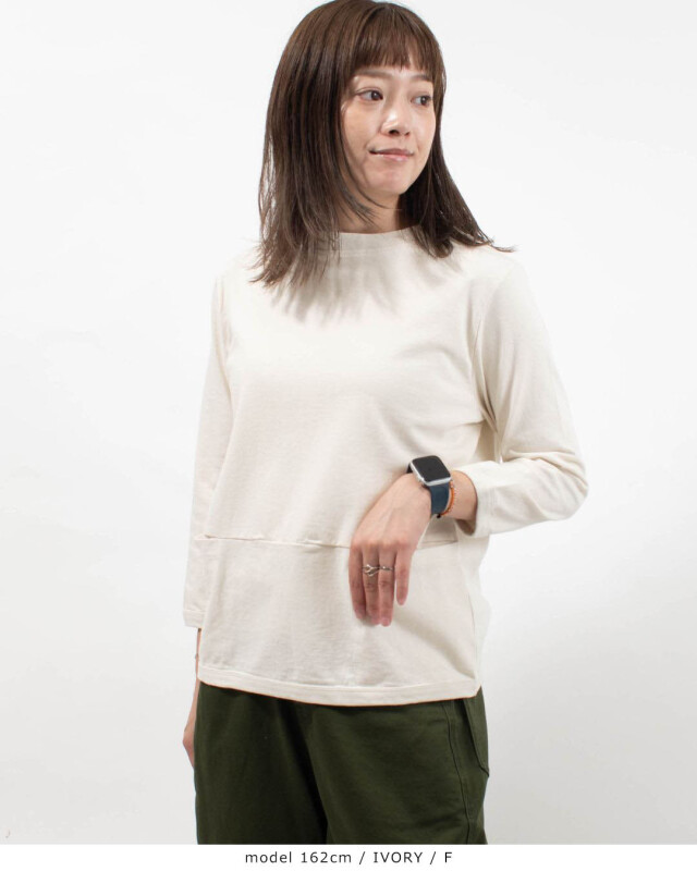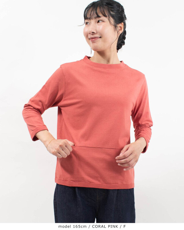 前身頃の切り替え位置にポケットが付いた、体のラインを拾いにくい、しっかりしたドライ感のある天竺を使用したポケット付き7分袖Tシャツです。