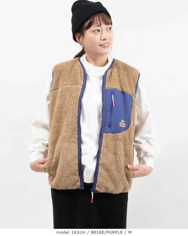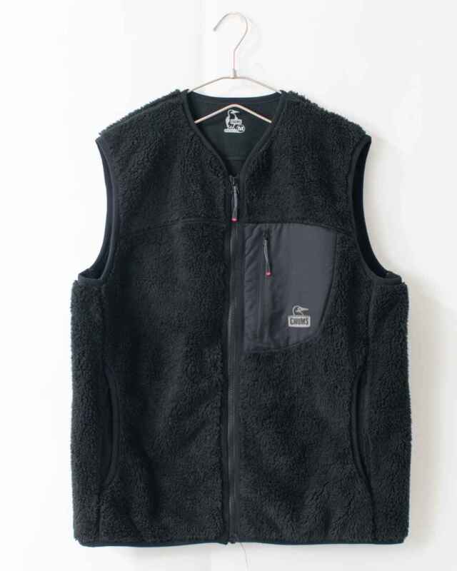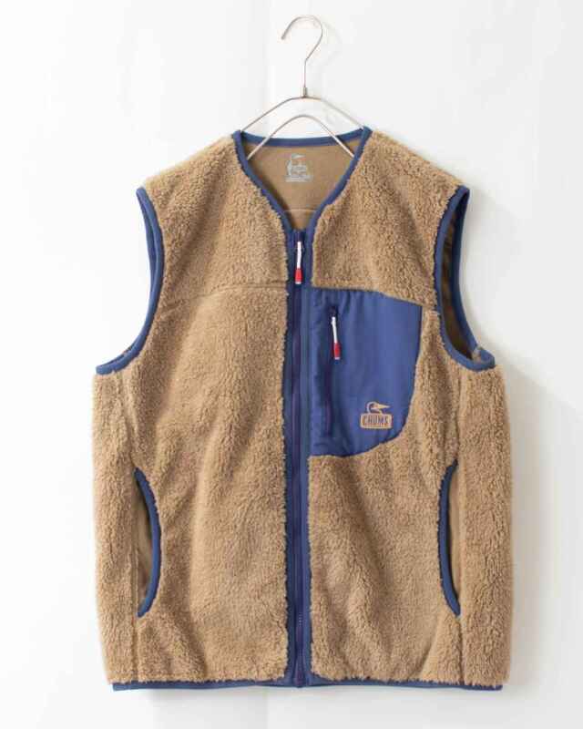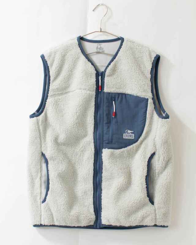 〈デザイン〉 CHUMSの冬の定番、ボンディングフリースを使用したノーカラーベスト。ブービーバードの羽やくちばしをモチーフにした曲線的なカッティングで、CHUMSらしいあそびゴコロを表現しました。