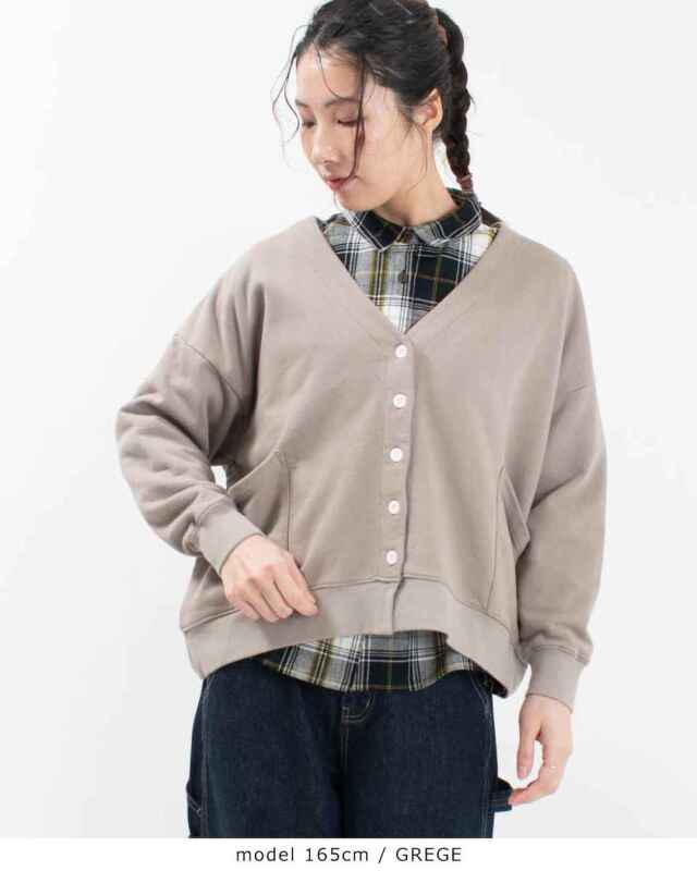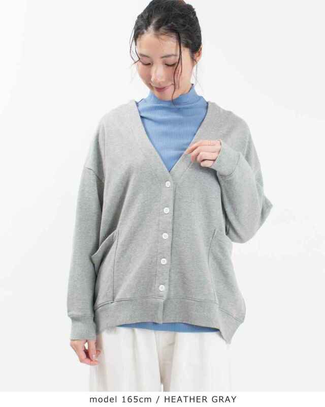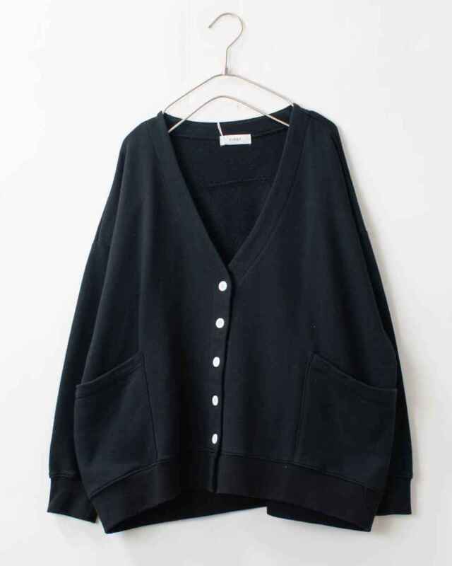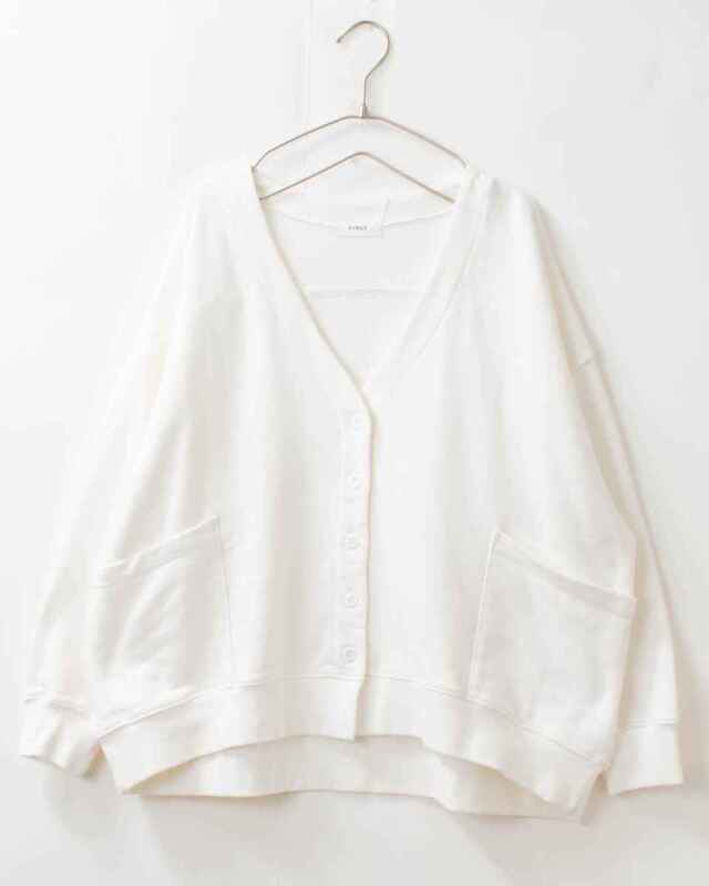 前後差のある丸いシルエットのVネックカーディガンです。薄すぎず、厚すぎず、程よい柔らかさの生地感。