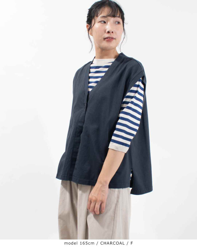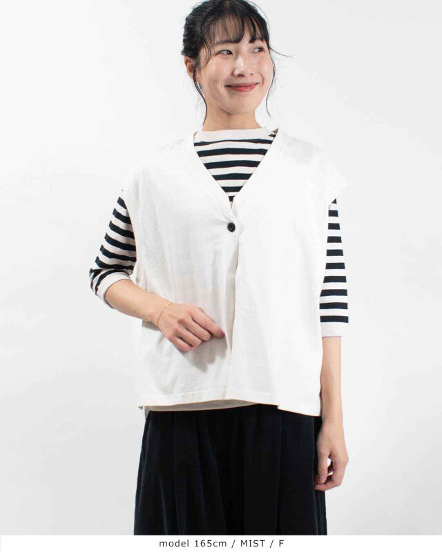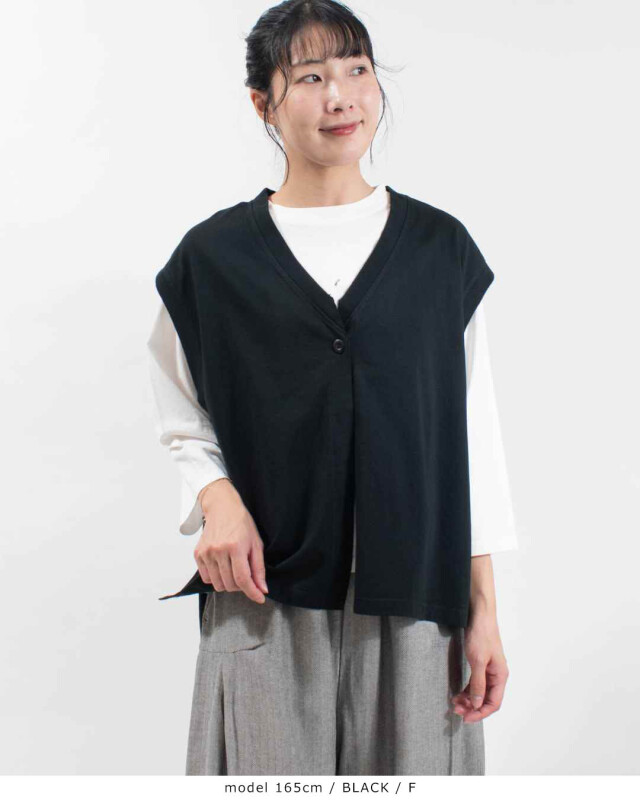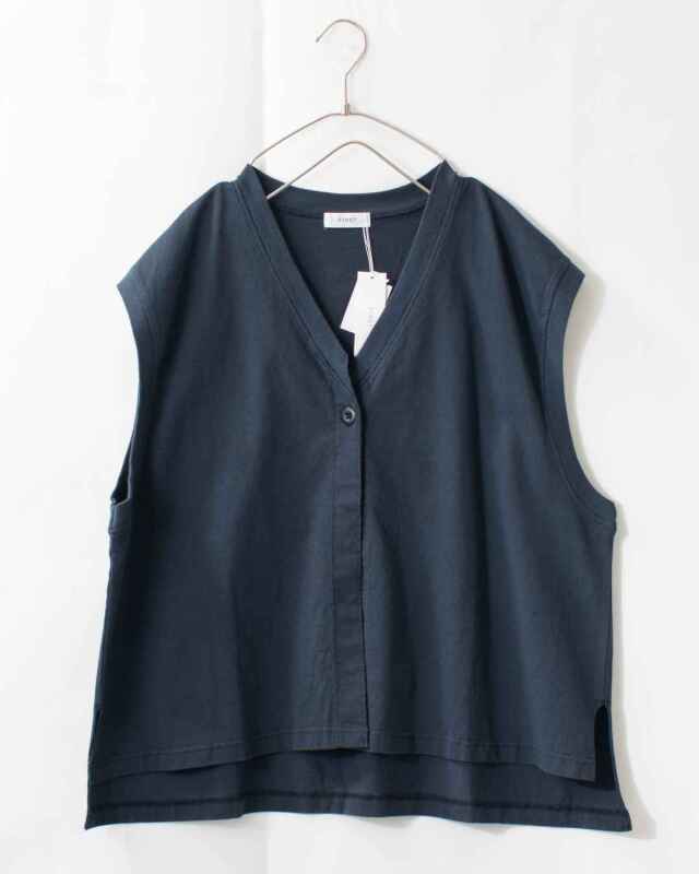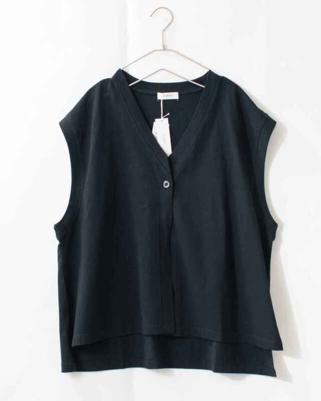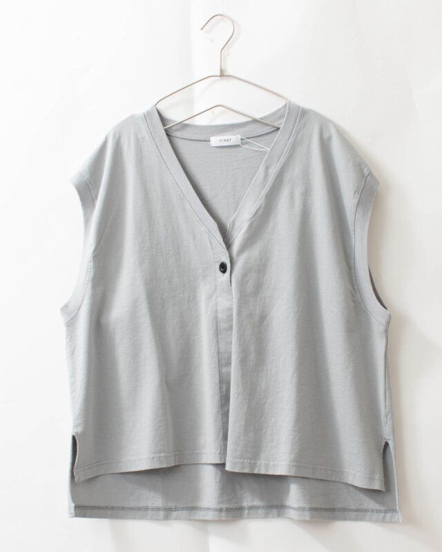 前立ての端がカットオフ(切りっぱなし)になっている前開きベスト。Vネックになっていて、ボタンが1つ付いています。