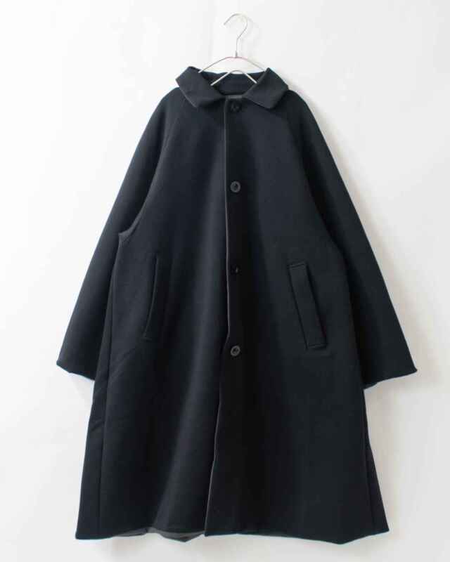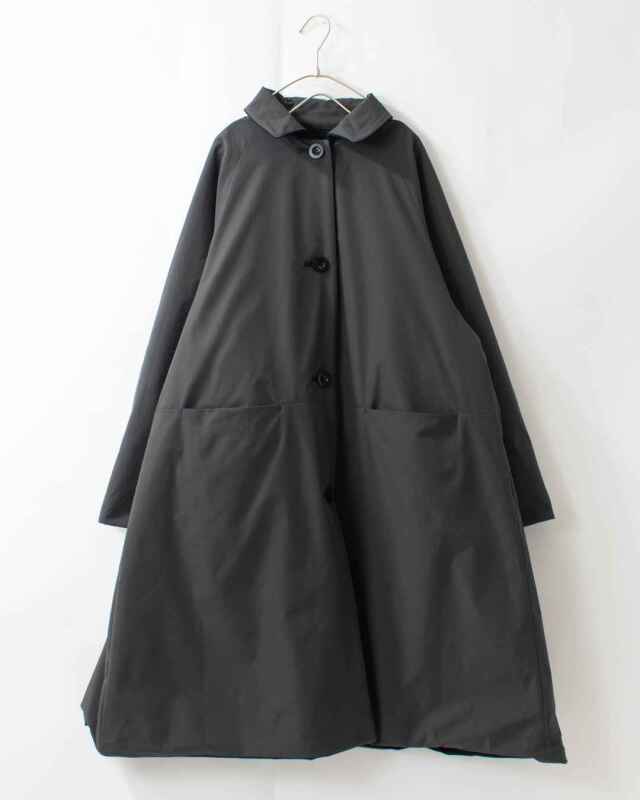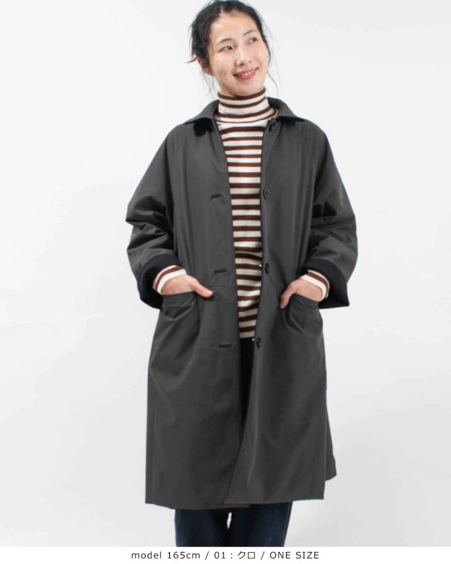 カットソー素材の表地と、マルーデコットンというネーミングが可愛い、コットンのようなポリエステル素材の裏地との2通りをお楽しみいただけるリバーシブルステンカラーコートです。