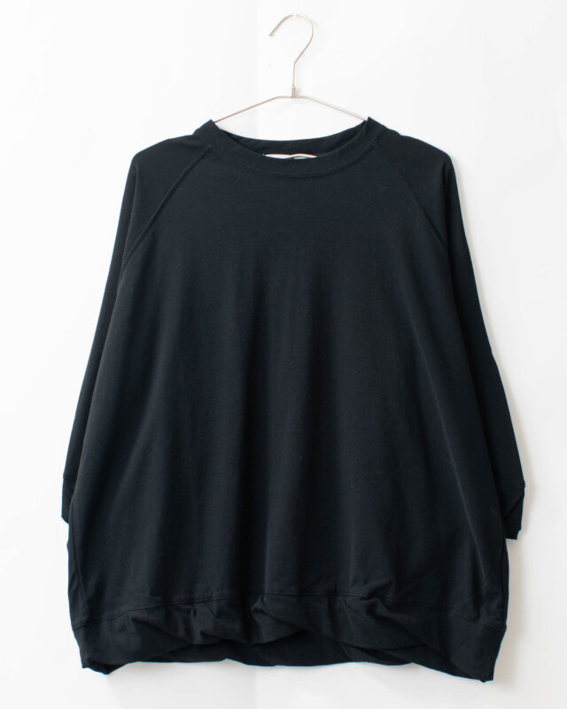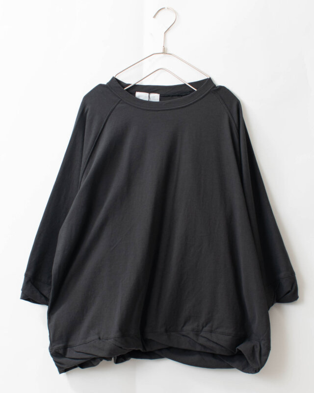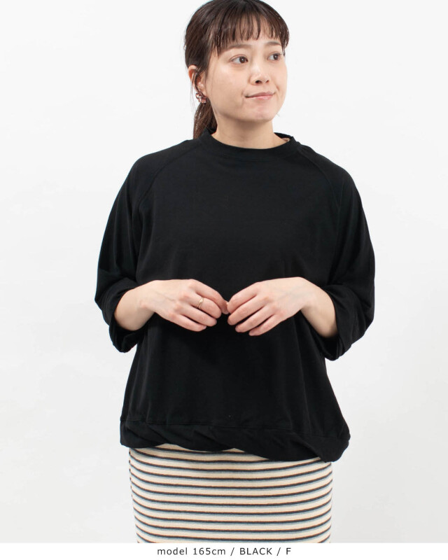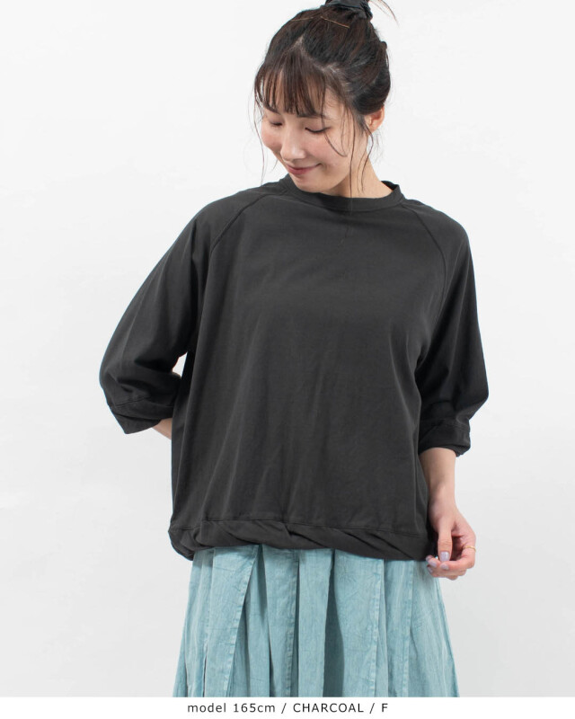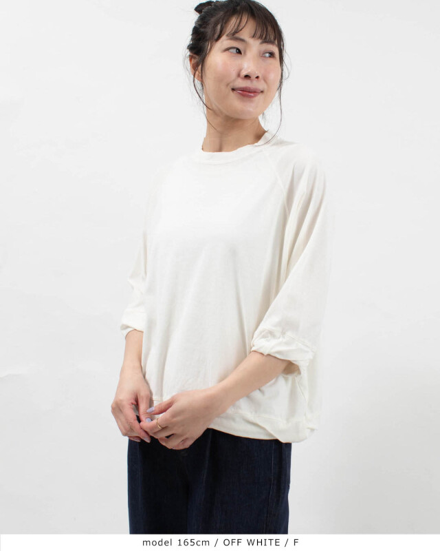 ラグランスリーブ仕様で肩まわりがもたつかず、動きやすさと華奢見えを両立。