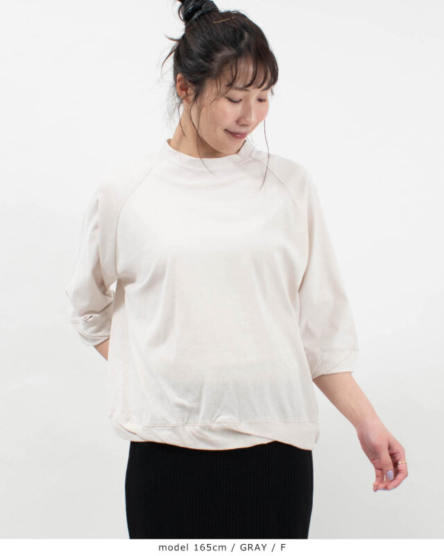 肘が隠れる5分丈の袖が二の腕をさりげなくカバーし、裾のタック入りリブがふんわりと立体感をプラス。