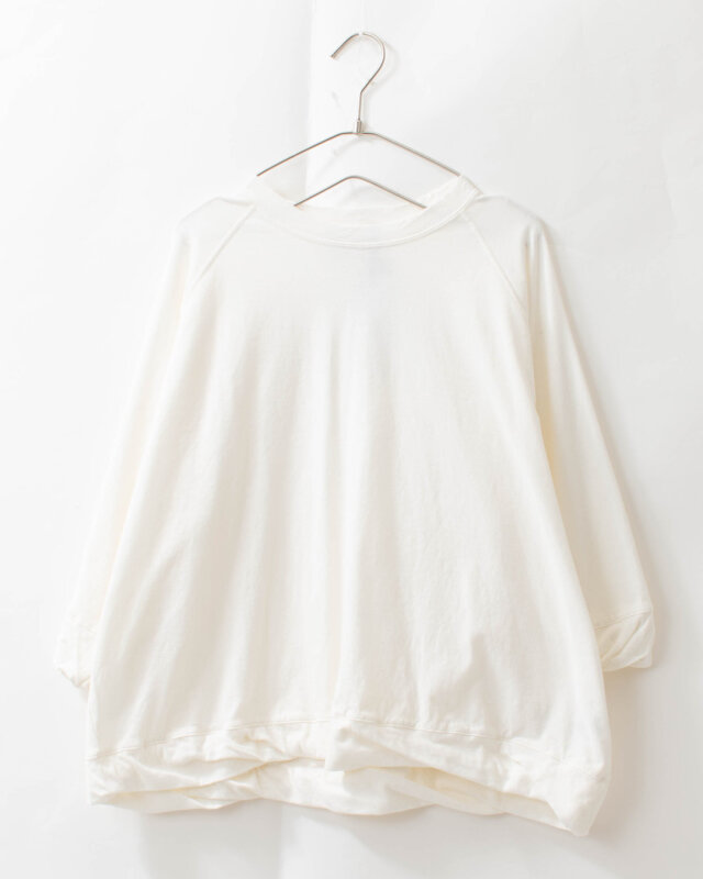 糸を撚る段階であえてムラをつくり、さらにウォッシュ加工を施すことで、着込んだような柔らかさとほのかなフェード感を表現したラグランスリーブのプルオーバー。