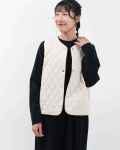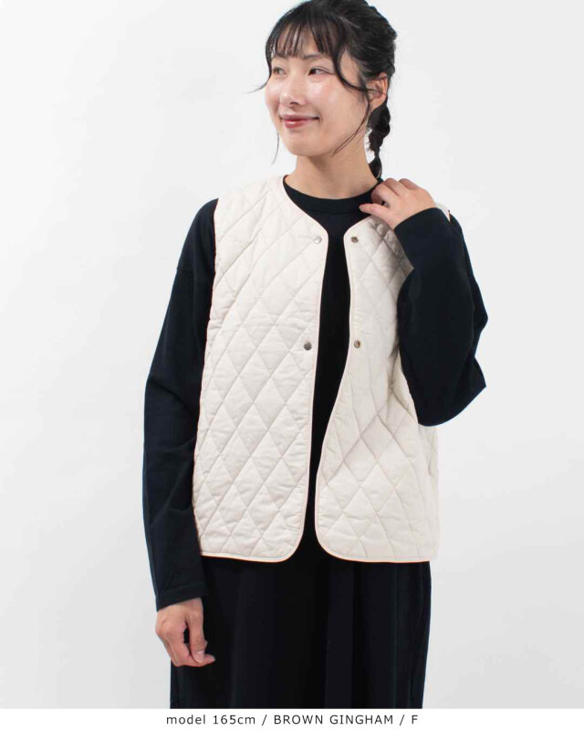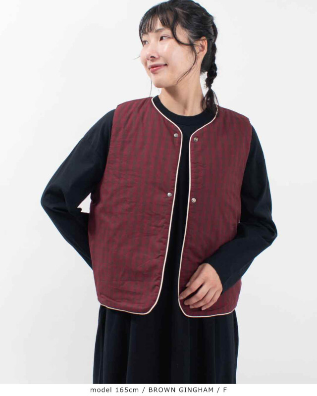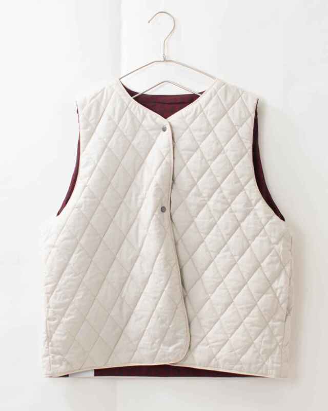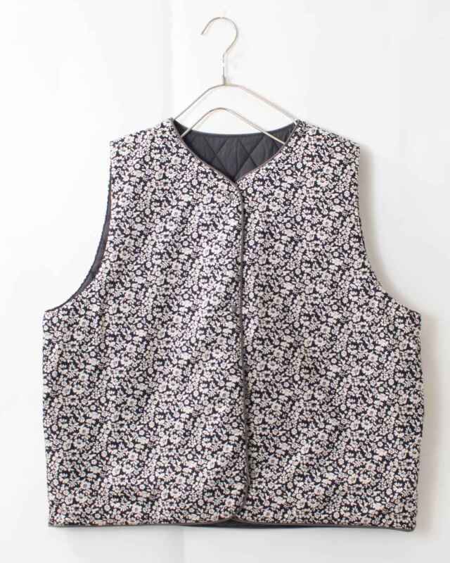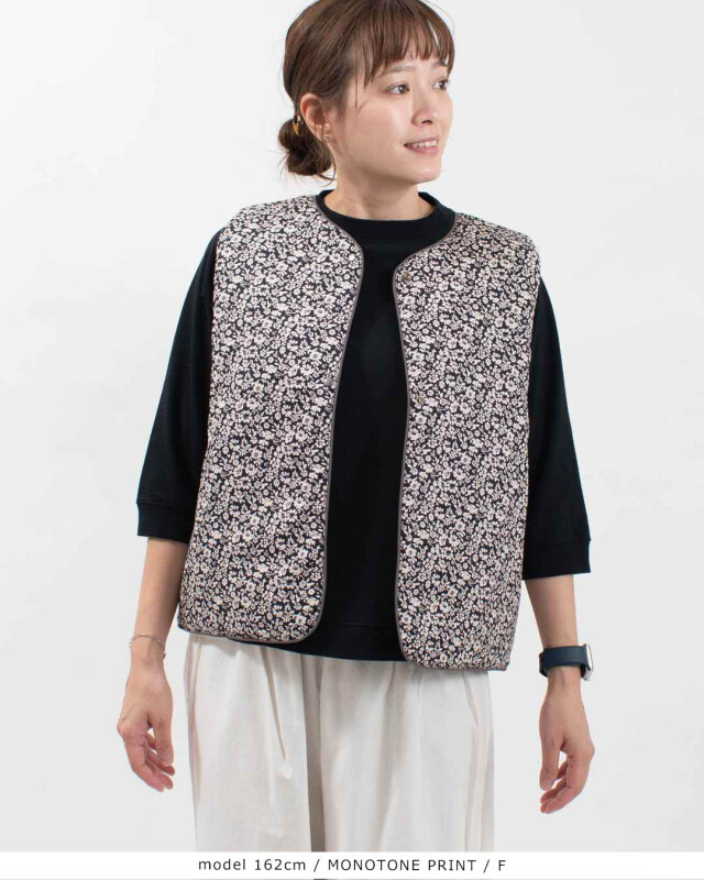 無地と柄の両方を楽しめるリバーシブル仕様のキルティングベストです。身幅はコンパクトですが、アームホールは広く取ってあるので