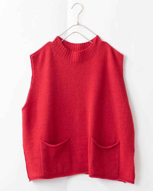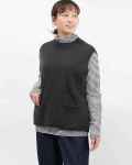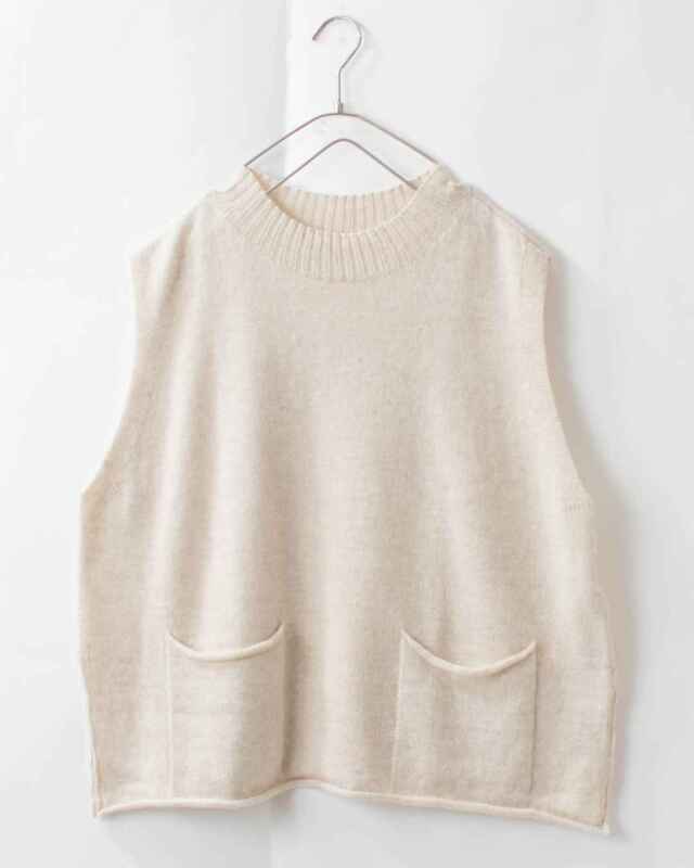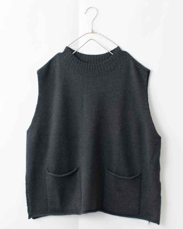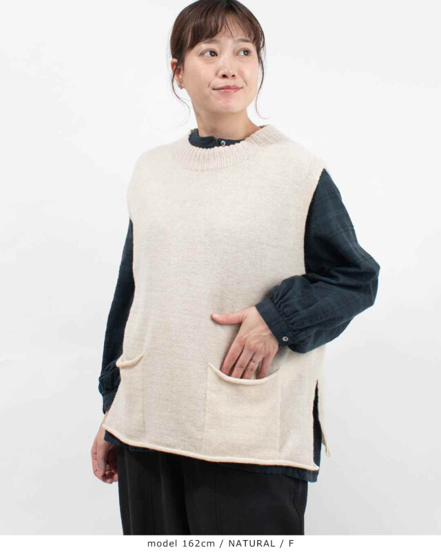 ウエストのポケットがポイントのベストです。脇に入ったスリットがブラウスだけでなく、チュニック・ワンピースにも合わせやすい一枚です。