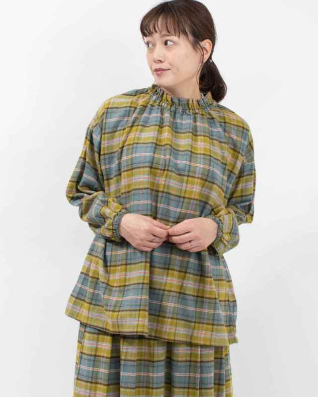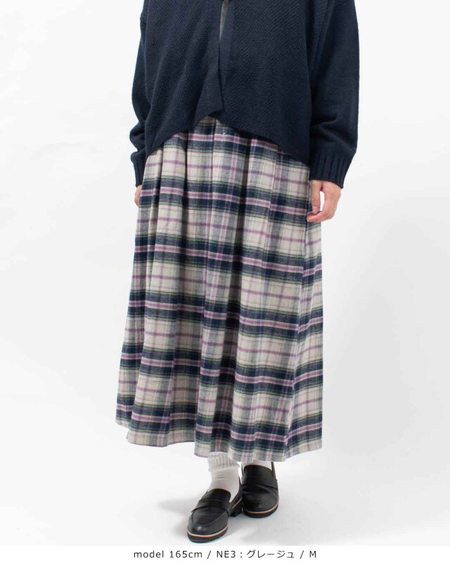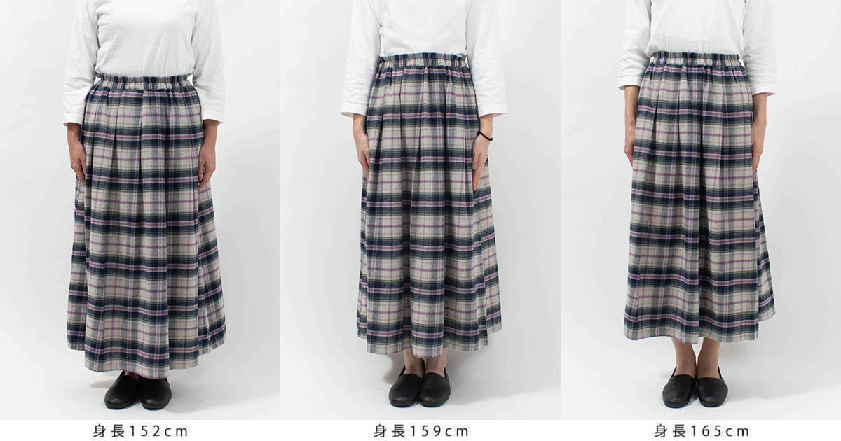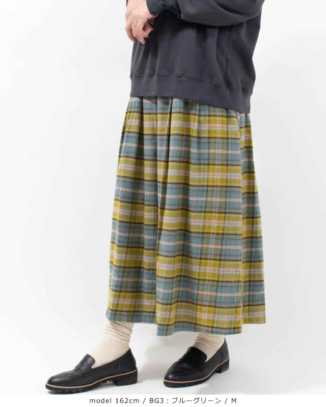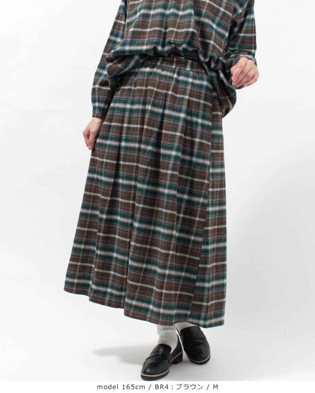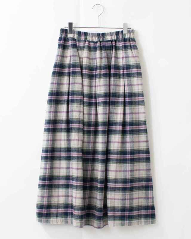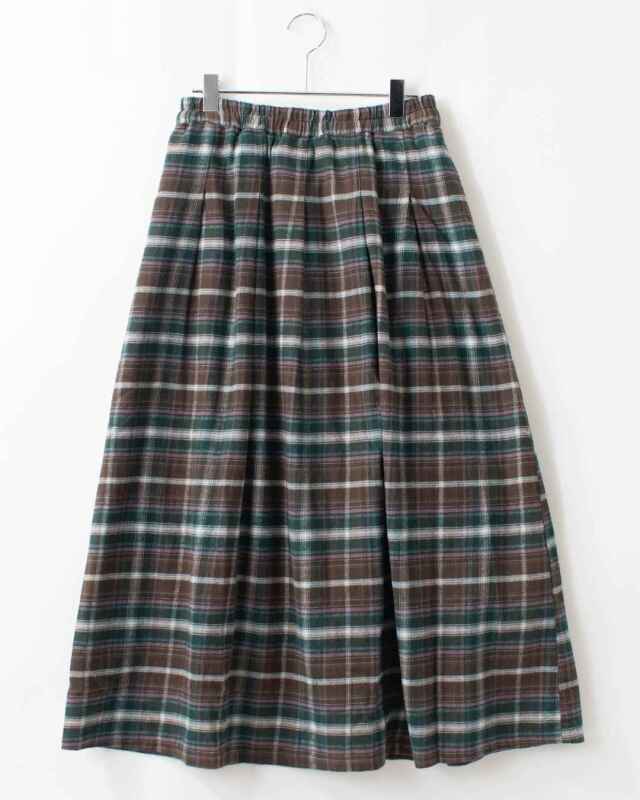 優しい肌触りのコットン綾織起毛チェックタックスカート。柔らかく滑らかな起毛感で、また重ね着もしやすい程よい厚みの素材です。