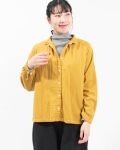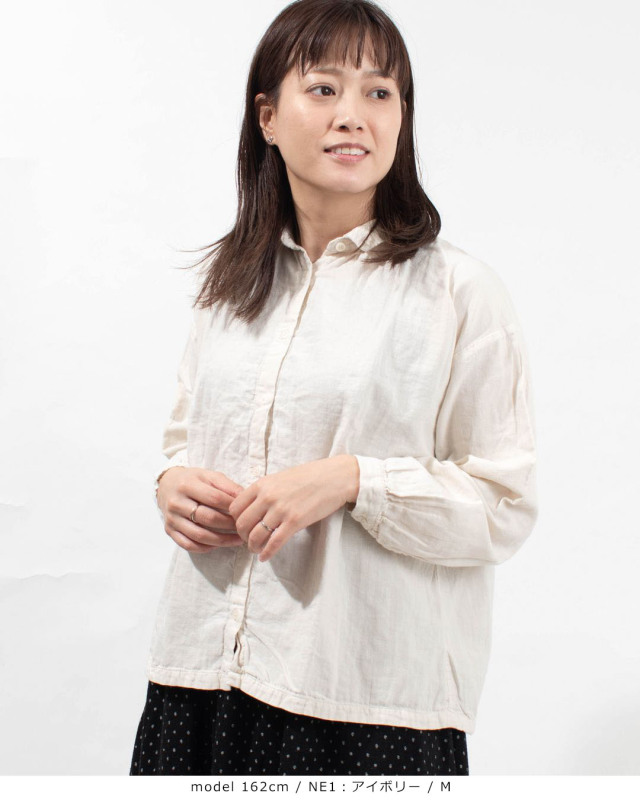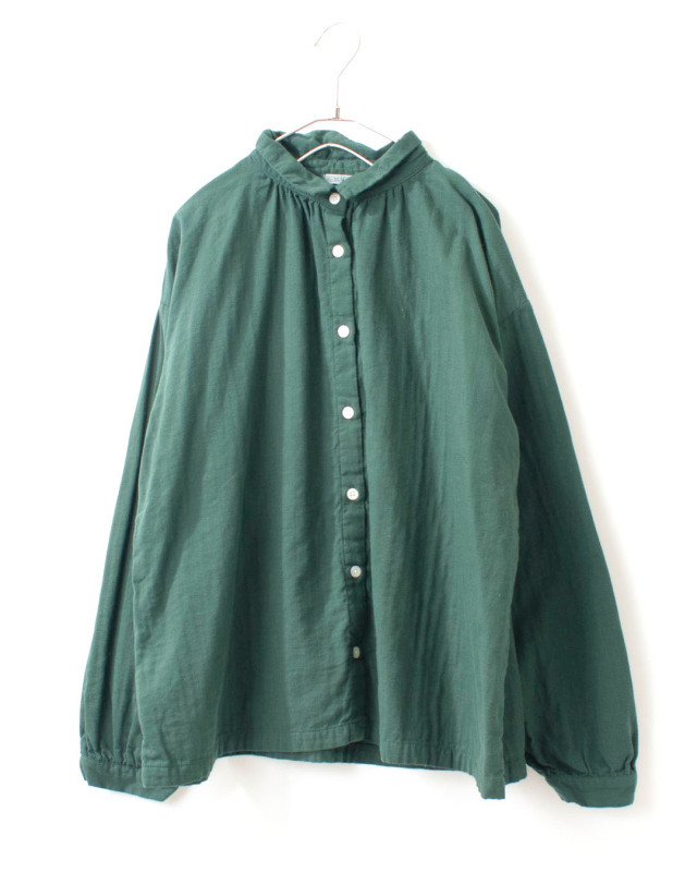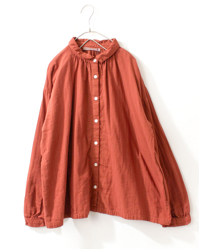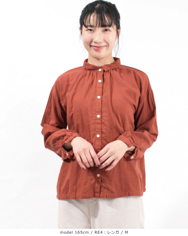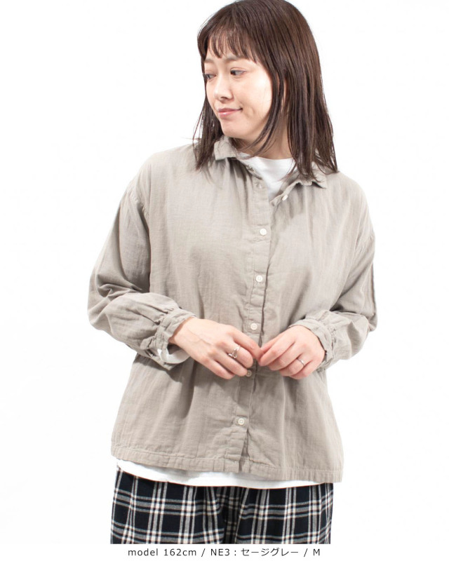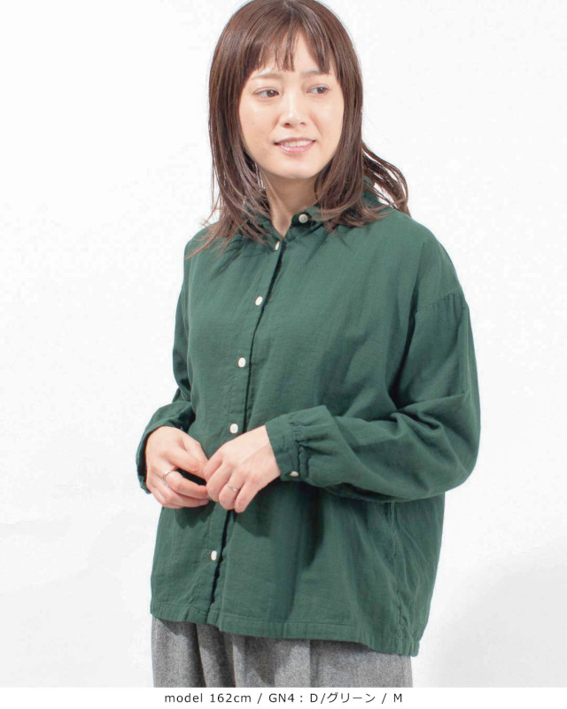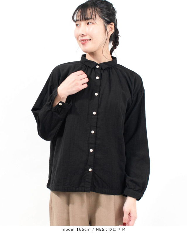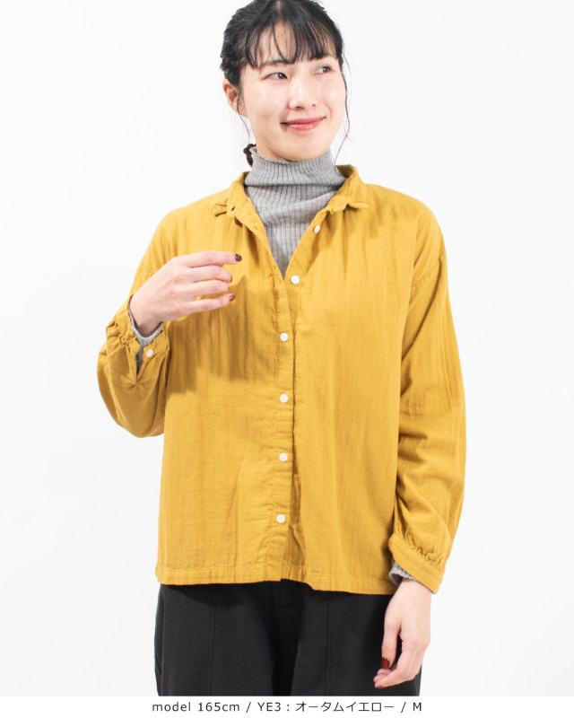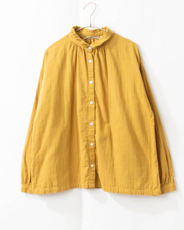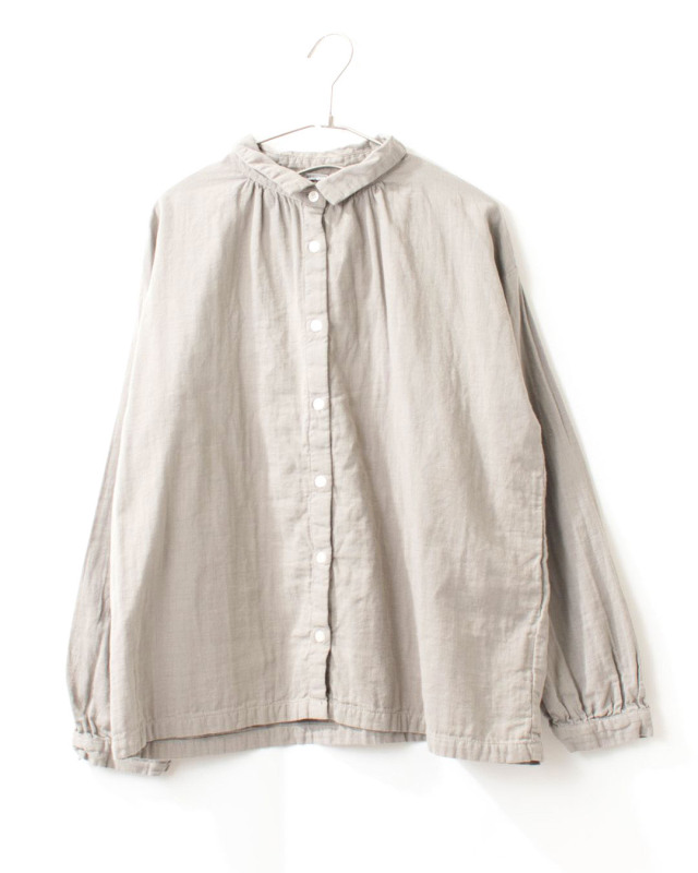 ふっくらとした厚みのコットンダブルガーゼギャザーシャツ。柔らかく優しい肌触りで軽い着心地の素材です。