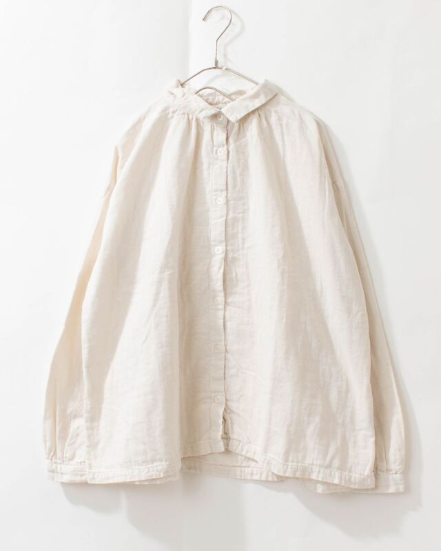 ゆったりと肩が落ちるドロップショルダーとゆとりある身幅で着心地よく、衿ぐりからはギャザーが入り裾に向かってふんわり広がる自然なシルエットをつくります。