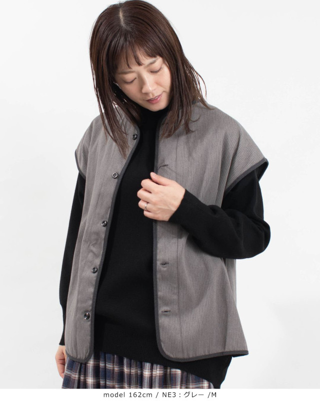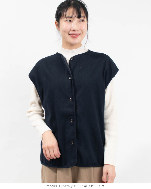 デニムの様な雰囲気のドビークロス綾織起毛裏ヘリンボーン素材を使用したリバーシブルベスト。カジュアルすぎずほんのりしなやかさのある風合いで、表面は微起毛された滑らかな肌触り、裏面は細かなヘリンボーン織りが雰囲気ある印象です。