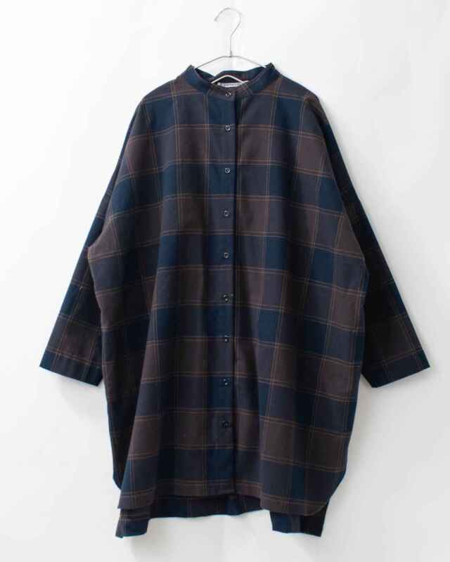 程よくコシのあるコットン平織起毛素材を使用した、ブロックチェック柄のワイドシャツチュニック。起毛加工を施し、見た目にも暖かみのあるやさしい風合いに仕上げました。