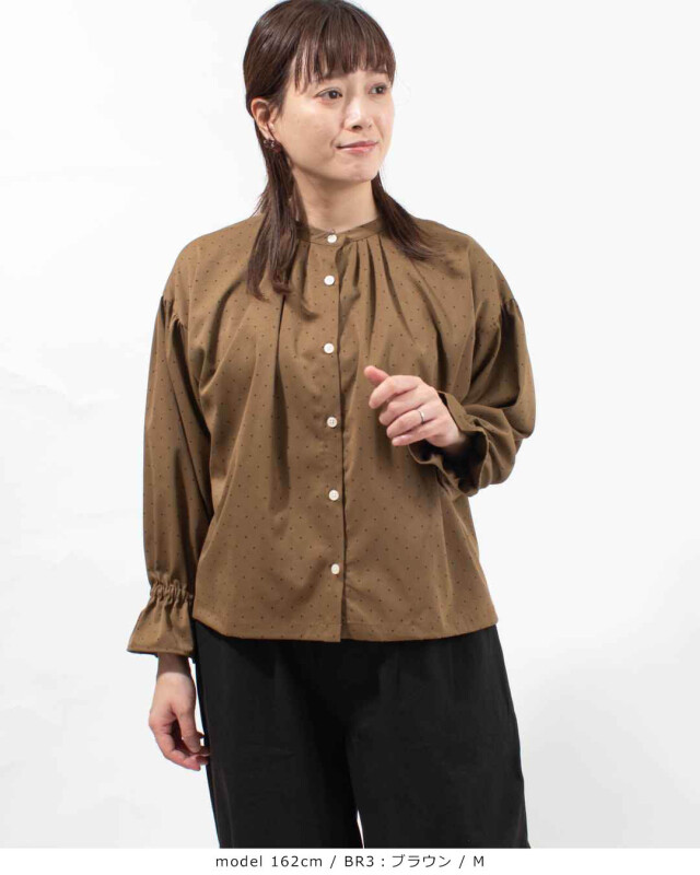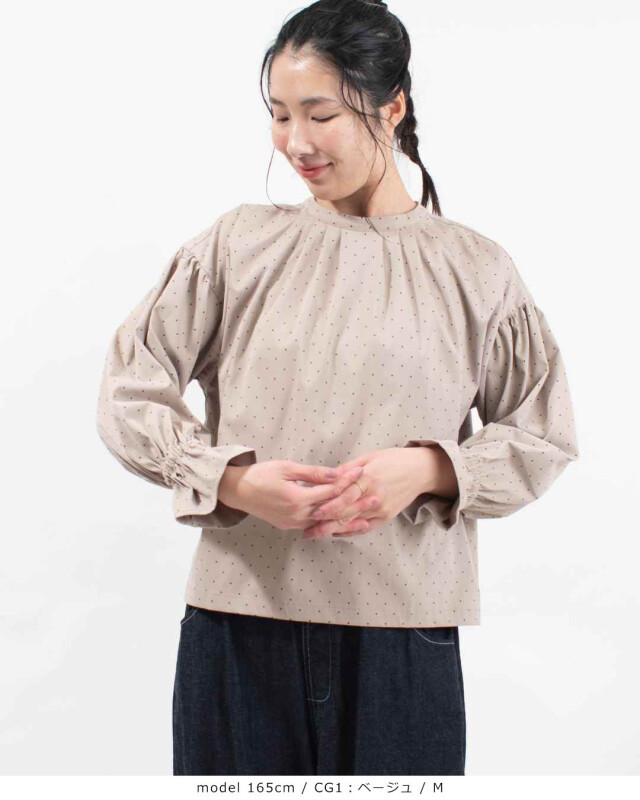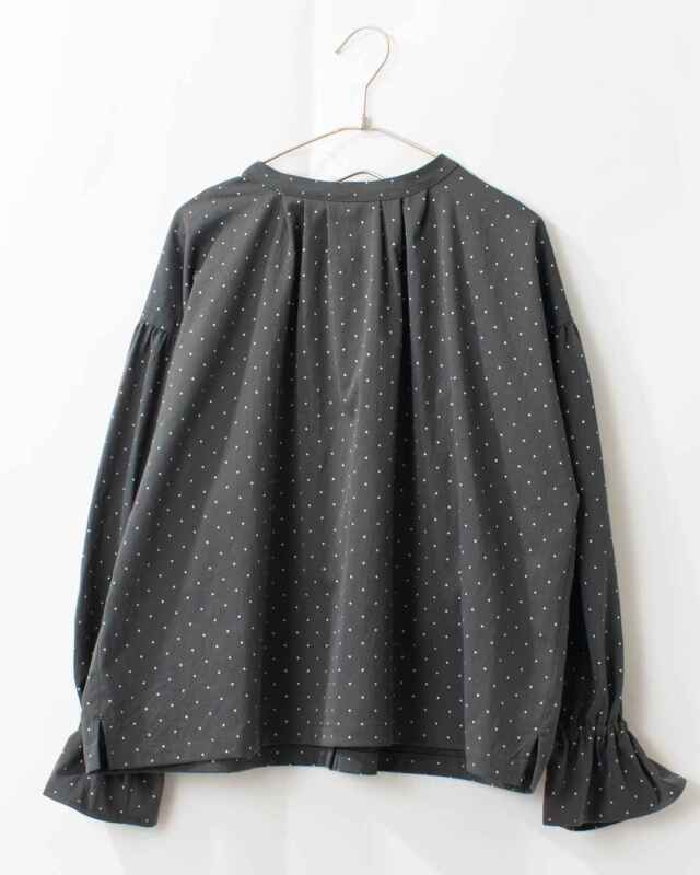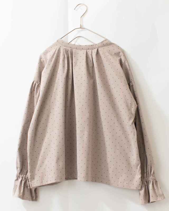 きちんと感のあるポリエステルツイルドットプリント2wayプルオーバー。柔らかく落ち感のあるしなやかな風合いの素材です。