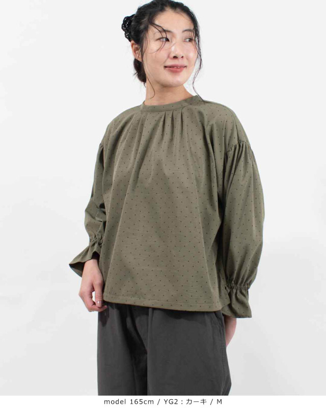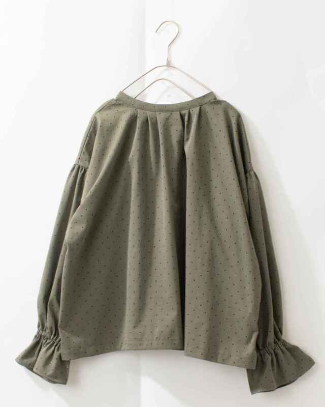 ギャザーが入ったゆったり袖は、袖口にゴムギャザーが入りふんわりアクセントあるフリル袖に仕上がりました。