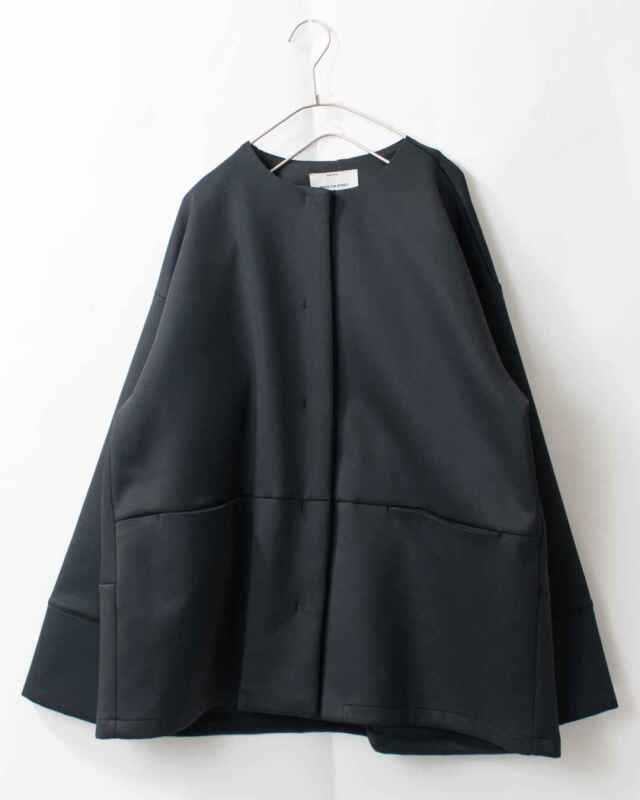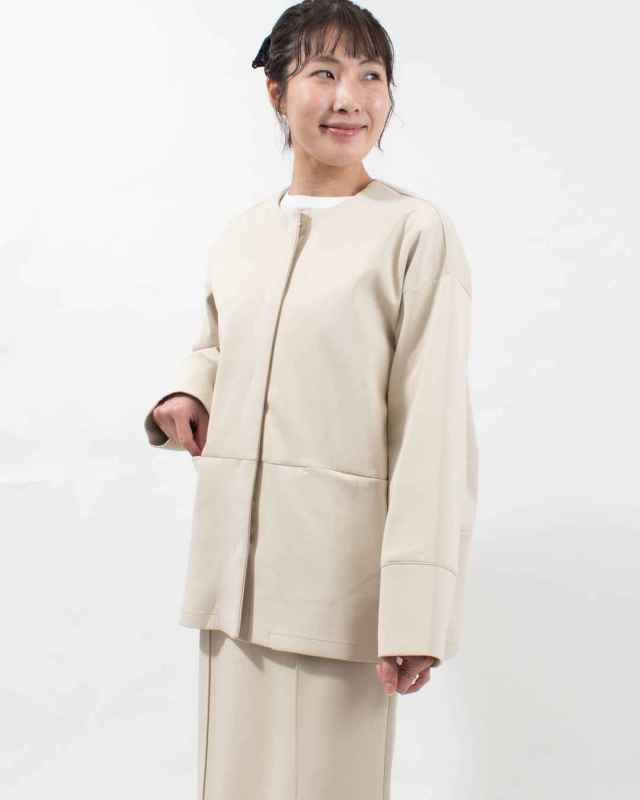 同素材のノーカラージャケットと合わせれば、統一感のあるセットアップスタイルに。