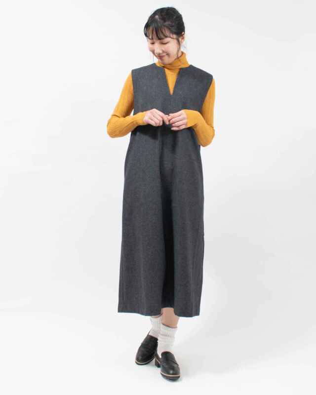 上品なキーネックのジャンスカを合わせたキレイ目コーデ。