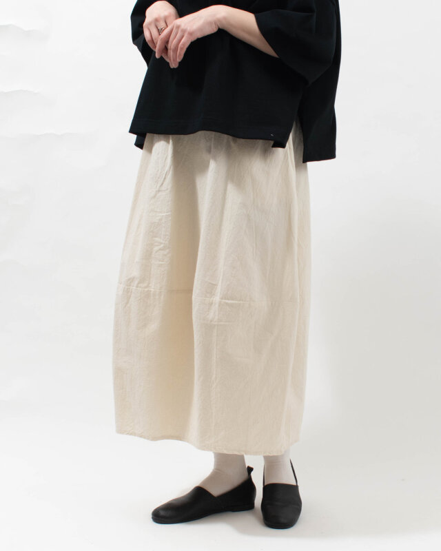 シンプルなモノトーンコーデながらも エッグシルエットのスカートがアクセントに♪ 小物はカジュアルなアイテムで合わすと軽やかで春らしくて◎ モデル身長:158cm