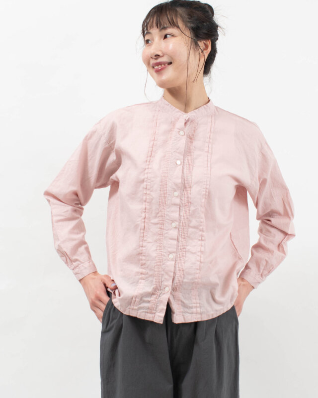 ピンクのブラウスを主役にロゴTシャツを合わせて