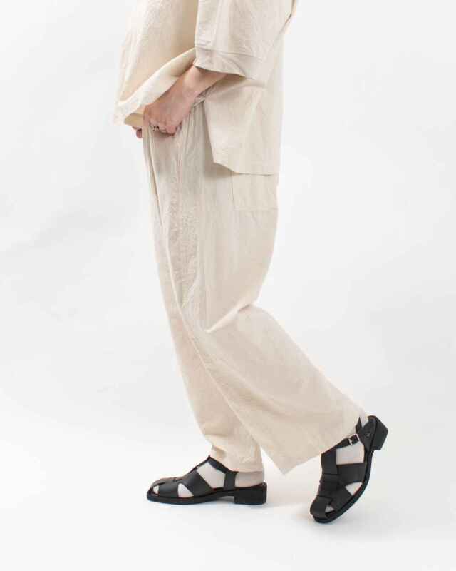 ゆったりとしたシルエットのナチュラルなセットアップには、 カジュアルなバックとサンダルを合わせて、ミックスコーデに。 モデル身長:163cm